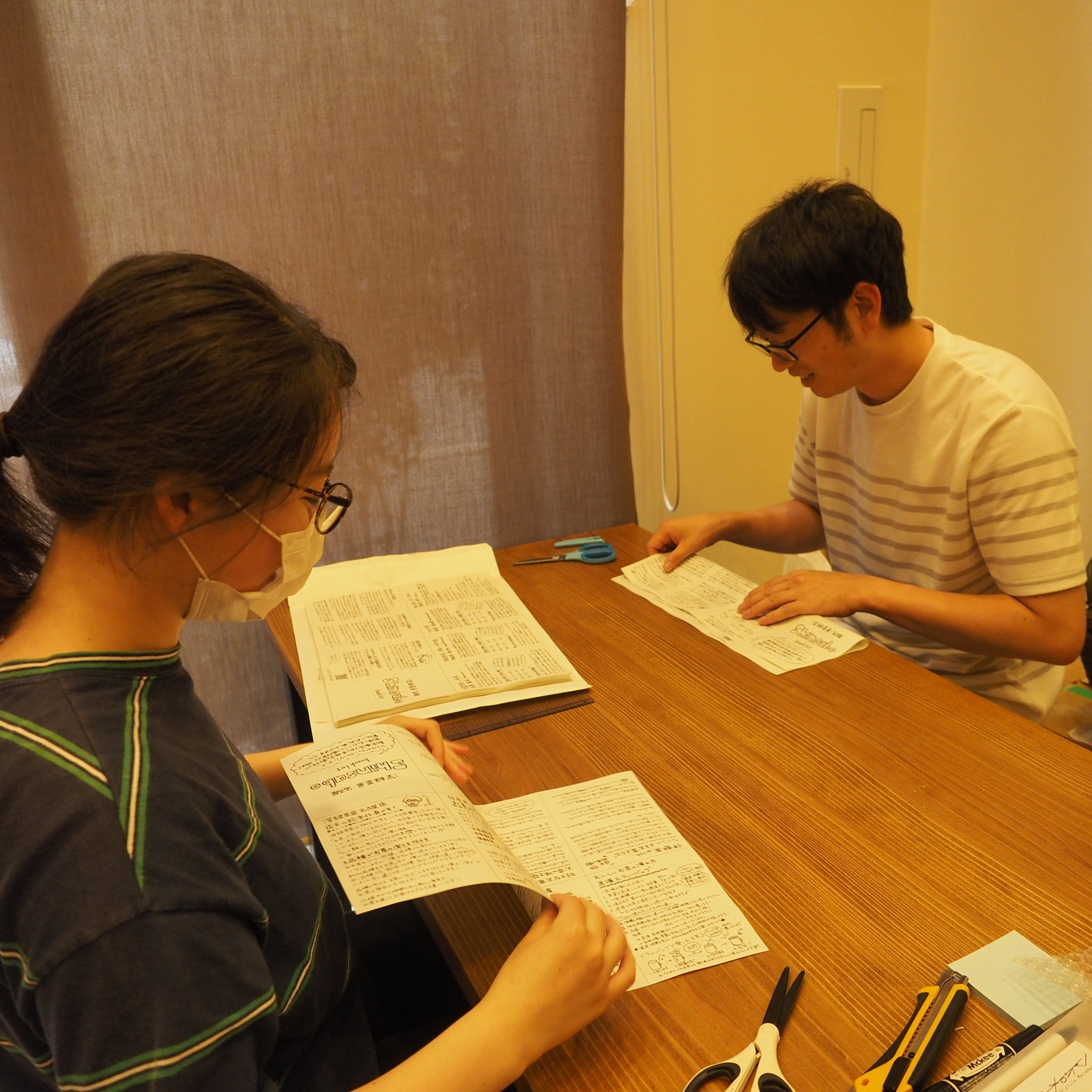 ↑ブックレットを組み立てるバイトスタッフと店主松本