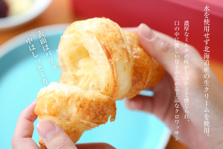 通常クロワッサンには生地を練る際に水を入れるのが主流ですが、当店は水の代わりに生クリームと牛乳をたっぷり使い生地を練り上げます。水を使わないことにより濃厚に生地が仕上がり、食べた時の食感は表面はパリッとし、中はしっとりとミルキーな味わいが特徴です。