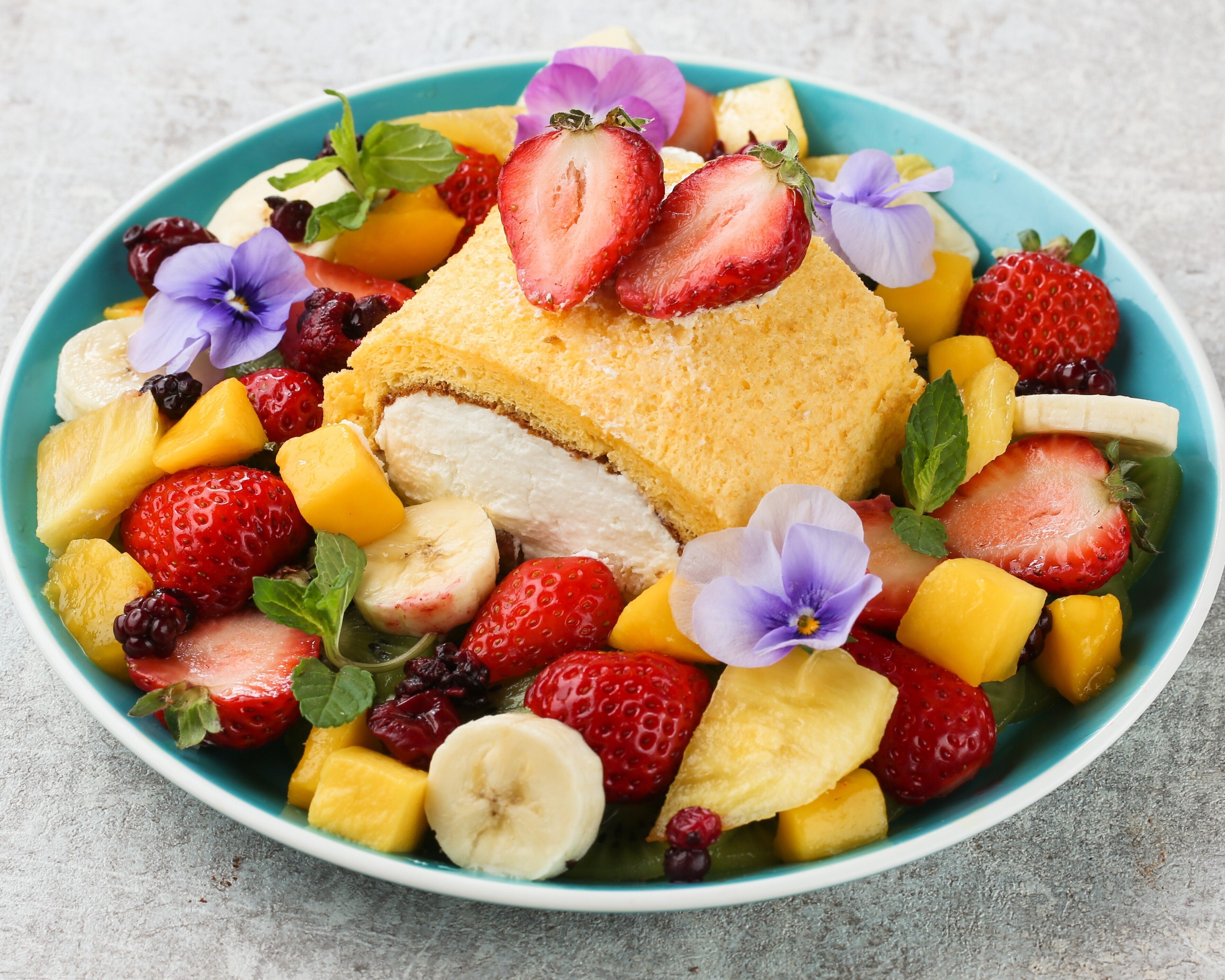 フルーツたっぷりロールケーキと季節のフルーツを使ったロールケーキの2種を各1本ご自宅にお届けさせて頂きます。