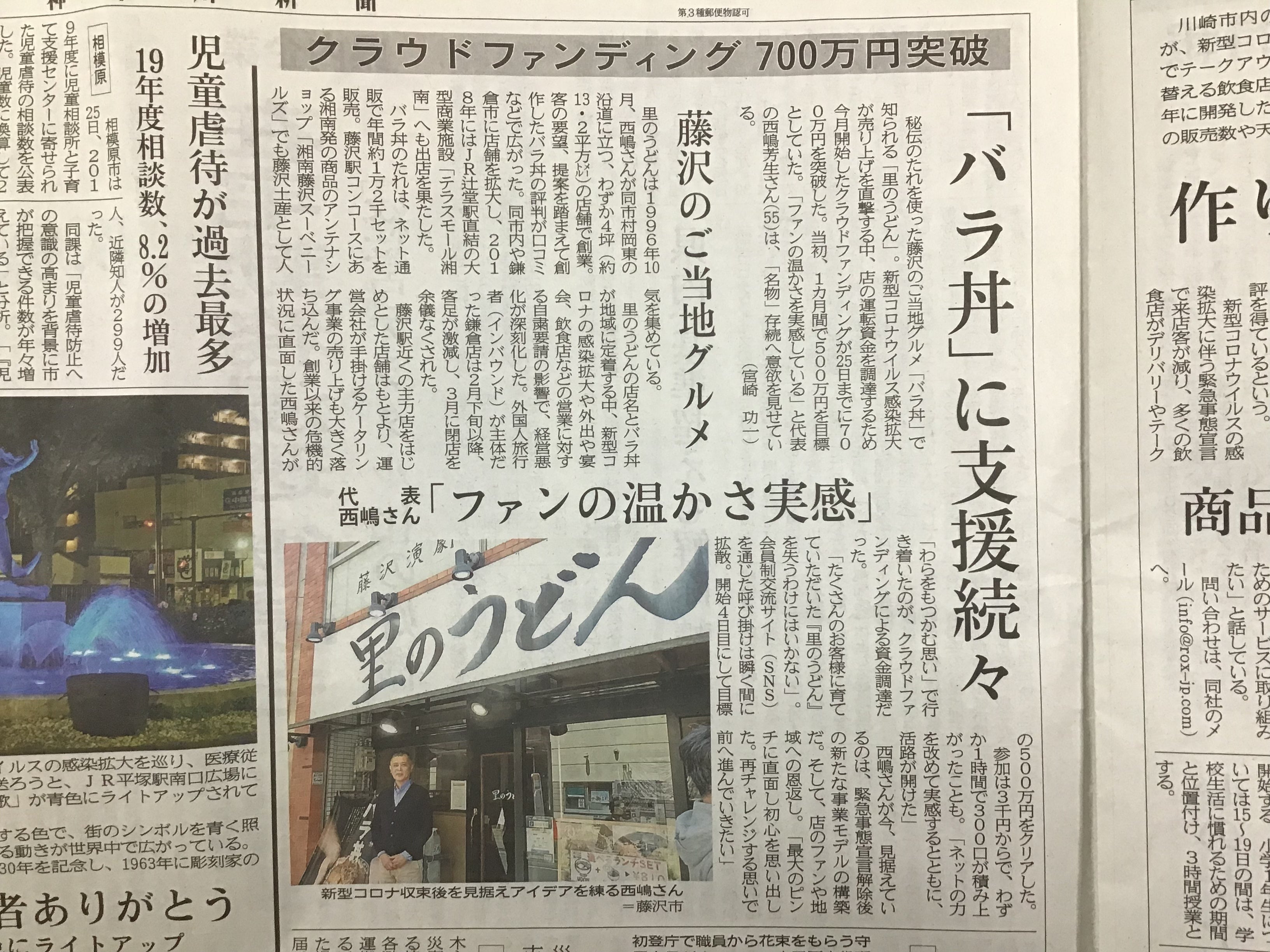 里のうどん」西嶋です。おかげさまで「里のうどん」クラウドファンディングは目標金額を大幅に上回る結果で終了することが出来ました。皆様誠にありがとうございました!皆様から頂いた暖かいメッセージに大きく背中を押して頂きました。緊急事態宣言も解除され、1日毎、日常を取り戻して行くことと思いますが、まだまだ油断できない日々が続いていることと思います。「里のうどん」も5月30日より全店再スタート致しました。今回ご支援頂いた御恩は、店舗運営において少しずつでは有りますが、お返しさせて頂ければと思っております。また、皆様へのリターンも7月より順次発送して参りますので、どうぞ宜しくお願い申し上げます。皆様、あらためて今回のご支援誠にありがとうございました!今後ともどうぞ宜しくお願い申し上げます。里のうどん 西嶋