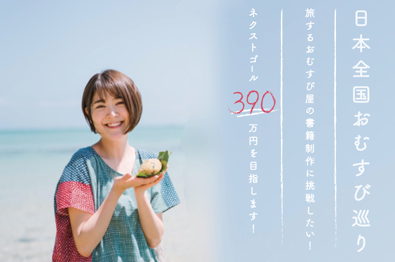 お陰様で第一目標だった300万円を達成しました!本当にありがとうございます。人生初の書籍出版。皆さんのお陰様で、より素敵な形で夢を実現できそうです。日本全国のおむすびを学んで書籍にする。自分への投資だと思って、貯金を切り崩して取り組もうと思っています。それでも、さすがにカメラマンさんに撮影いただいたりすることは無理だろうな…たくさん出会うであろう素敵な瞬間を逃さず届けたいけど…と、思っていたのですが皆様のお陰様で、それも夢ではなくなってきました!ネクストゴール、390万円を達成したら、旅の様子を映像にもまとめて子どもたちにより伝わりやすくしたり、世界の方にも発信したりしていけたりできたらと思っています(^^)最後まで応援よろしくお願いします!本当にありがとうございます!