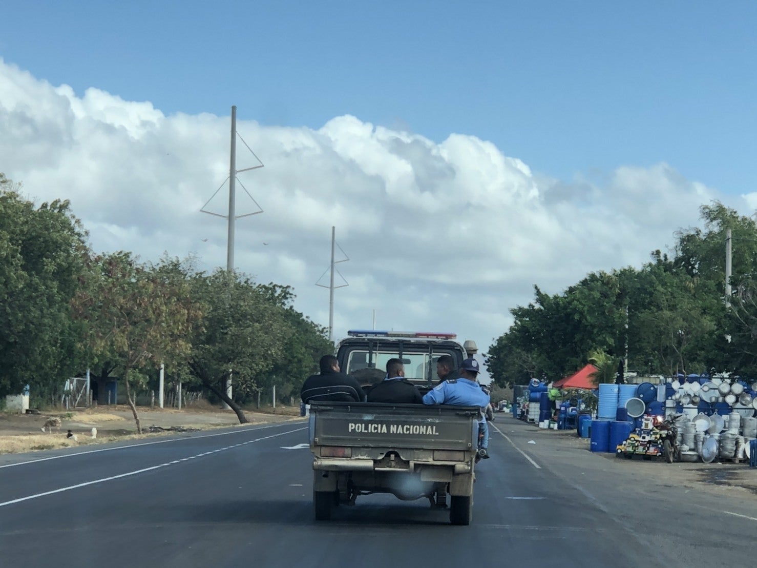 バスも走っていますが、移動手段として相乗りをする文化があり、警察車両も同じく荷台に警察官を載せています。