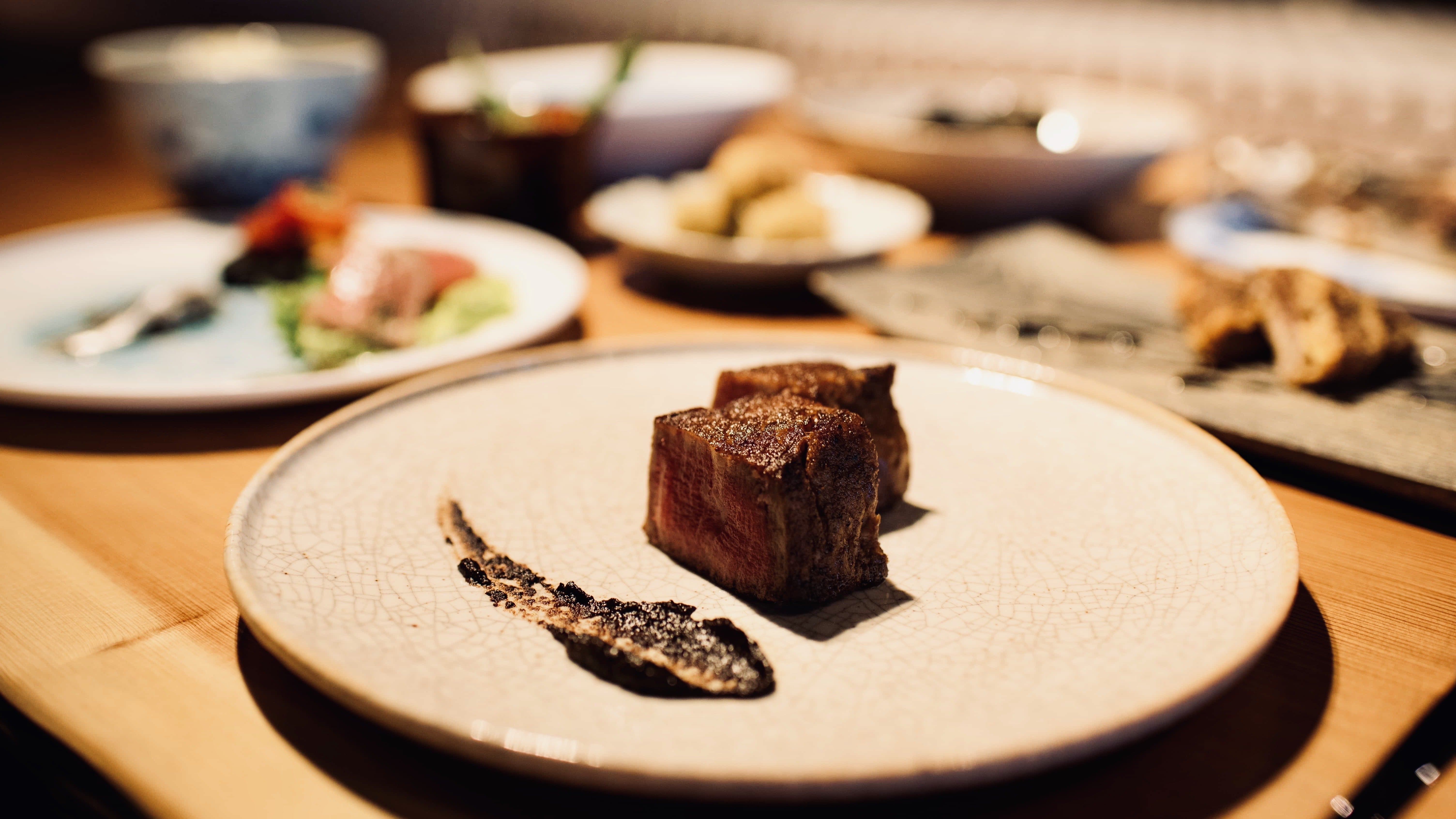 熊野牛をつかったメイン料理(炭塩や黒にんにくソースで)