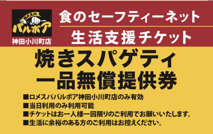 バルボア小川町店限定!所得減少等で困っている方々にスパゲッティを無償提供したい