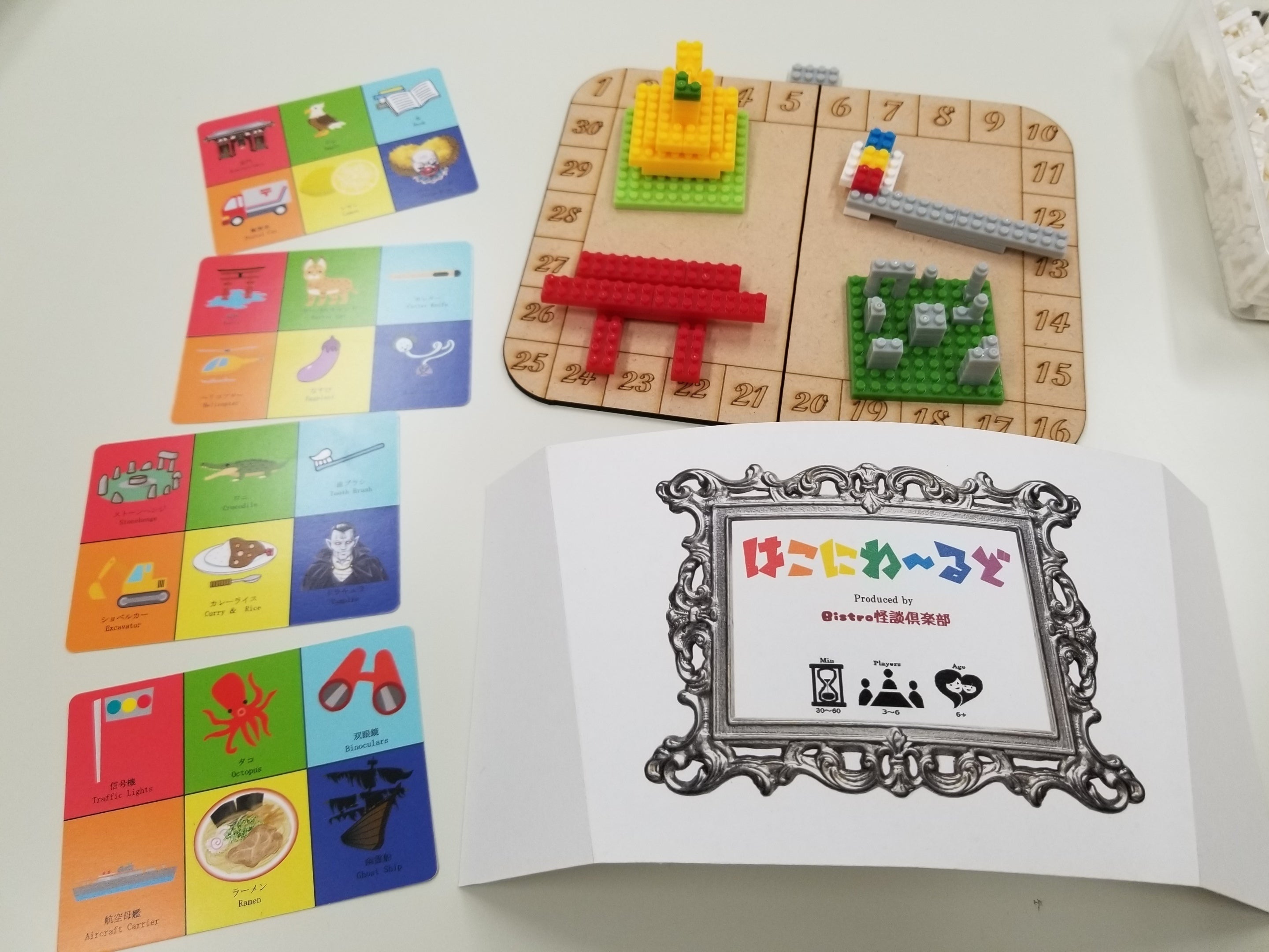 ブロックや小麦粘土でお題の物を作って、時には協力、時には出し抜きながらそれぞれの箱庭を創作していく伝言ゲームの様なゲームです。 - [内容物]