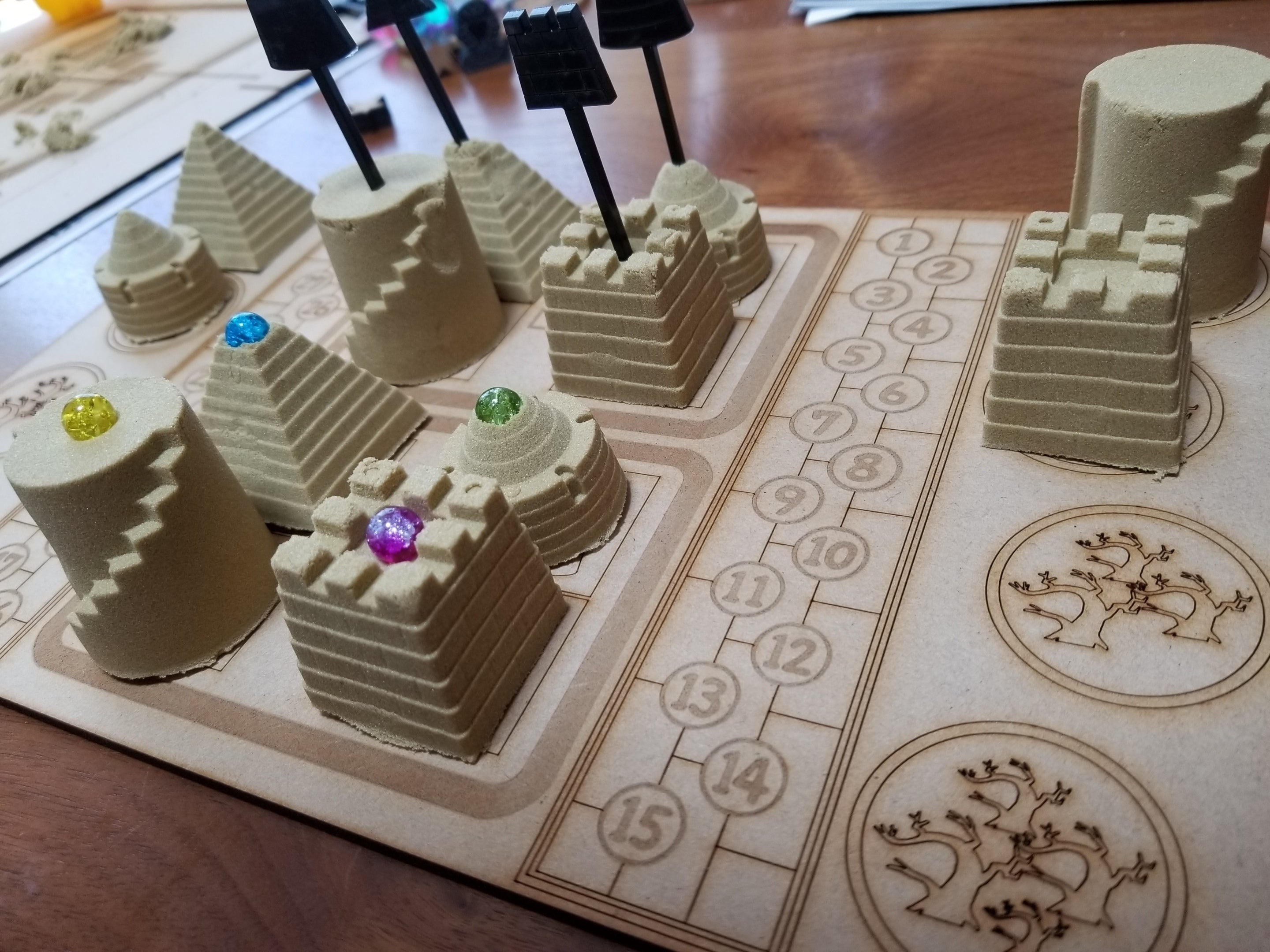 セッティングした大ピラミッドから切り出した砂を利用して、自分の個人ボードに建物を建設して、街を再興しつつ得点を獲得していきます。
