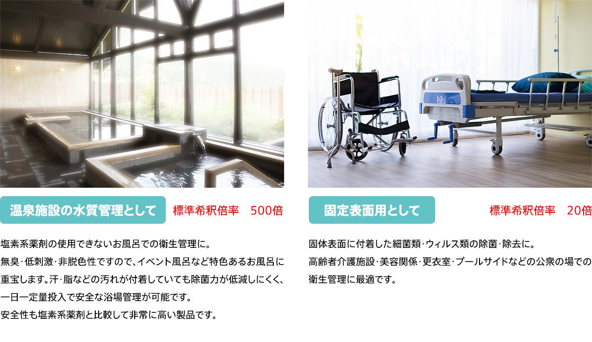 国内でも有機物の多く存在するコンタクトレンズの保存液、温泉施設、ウェットティッシュなどに、その安全性を見込まれて採用されています。