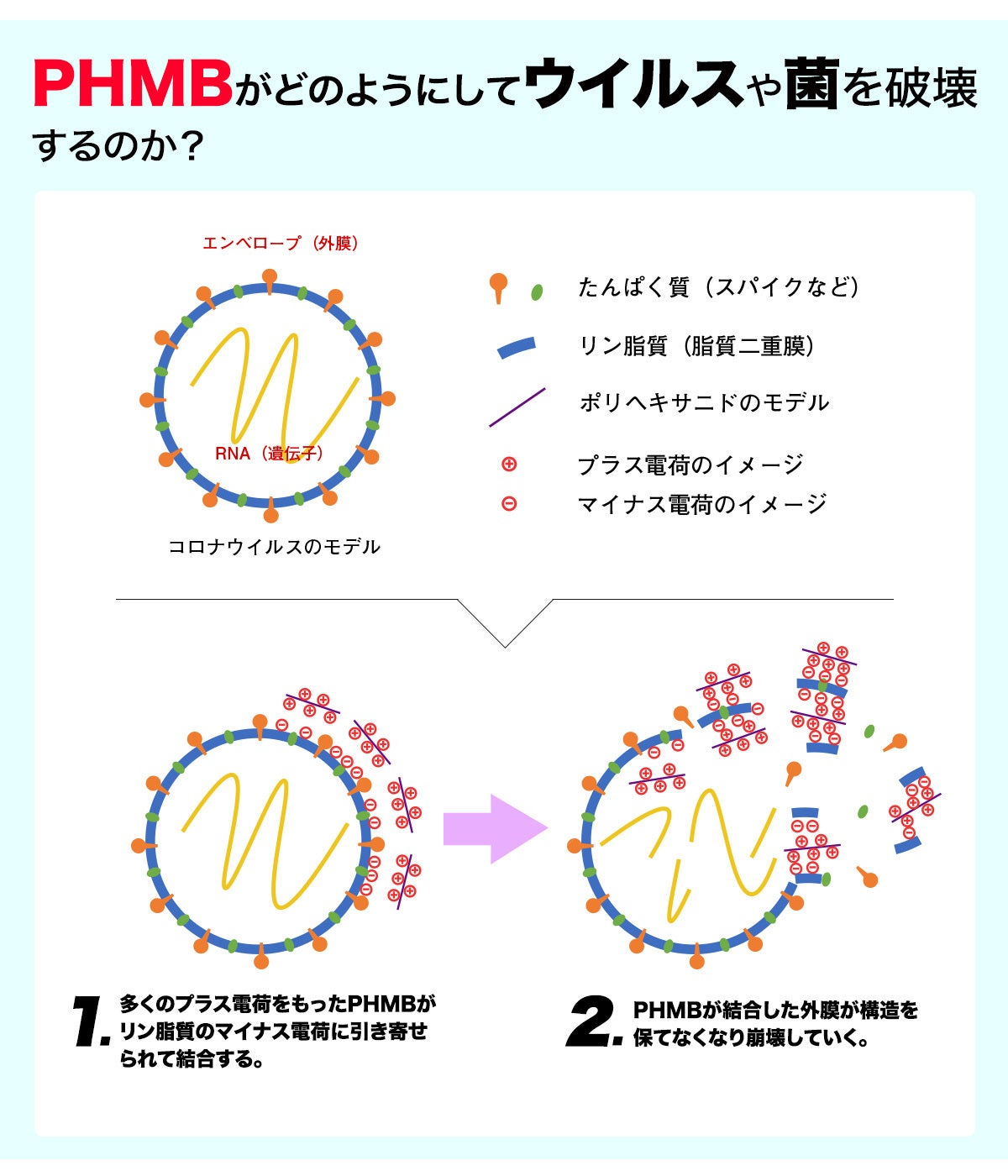 PHMBは薬として作用するのではなく、ウィルスのエンベロープ(外膜)の脂質を電気分解、破壊することで、ウィルスを死滅させます。したがって耐性菌を作り出すこともありません。