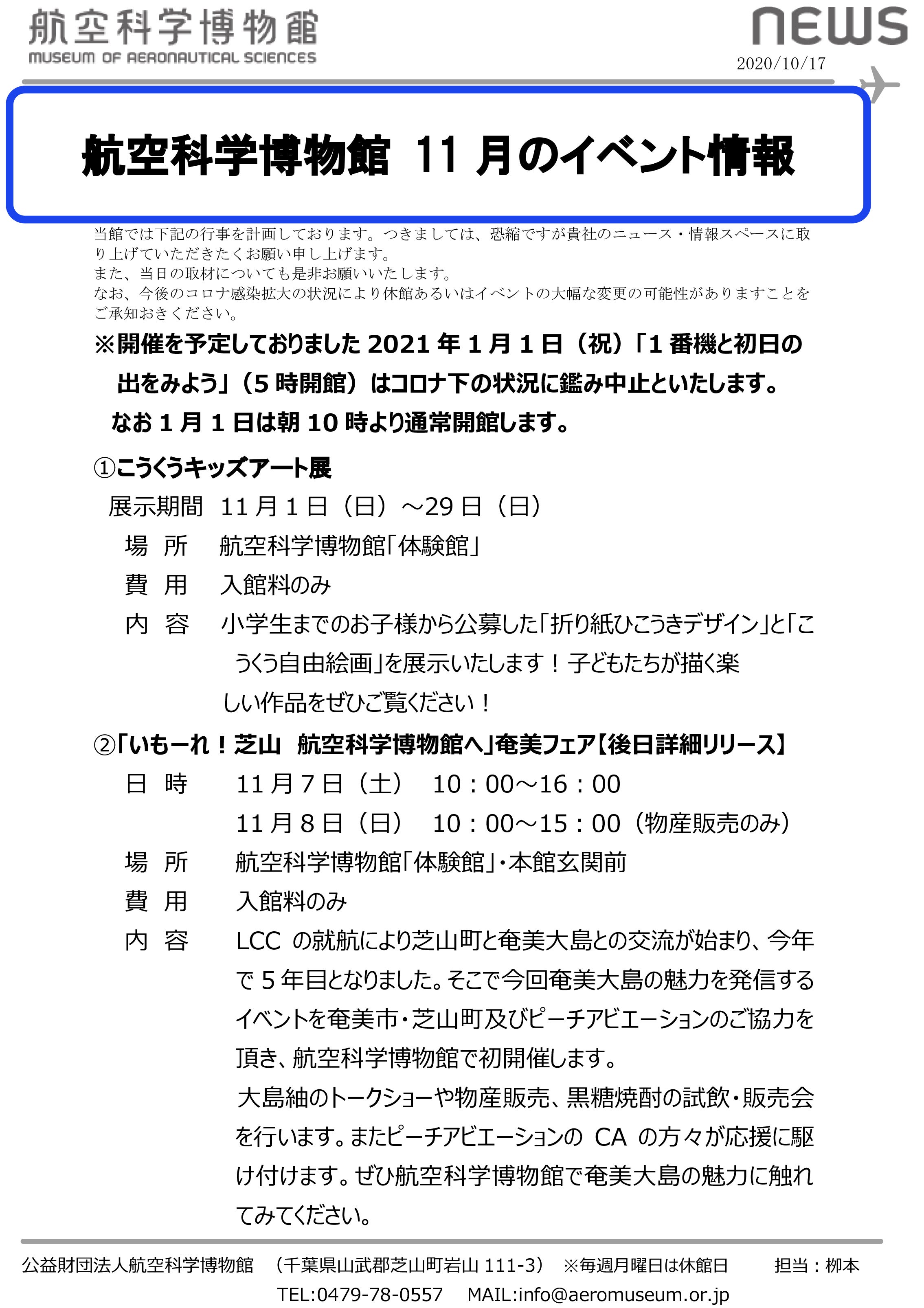 また、今月も様々なイベントを開催予定です。中でも11月7日(土)「いもーれ!芝山 航空科学博物館へ」奄美フェアは初のイベントとなっております。