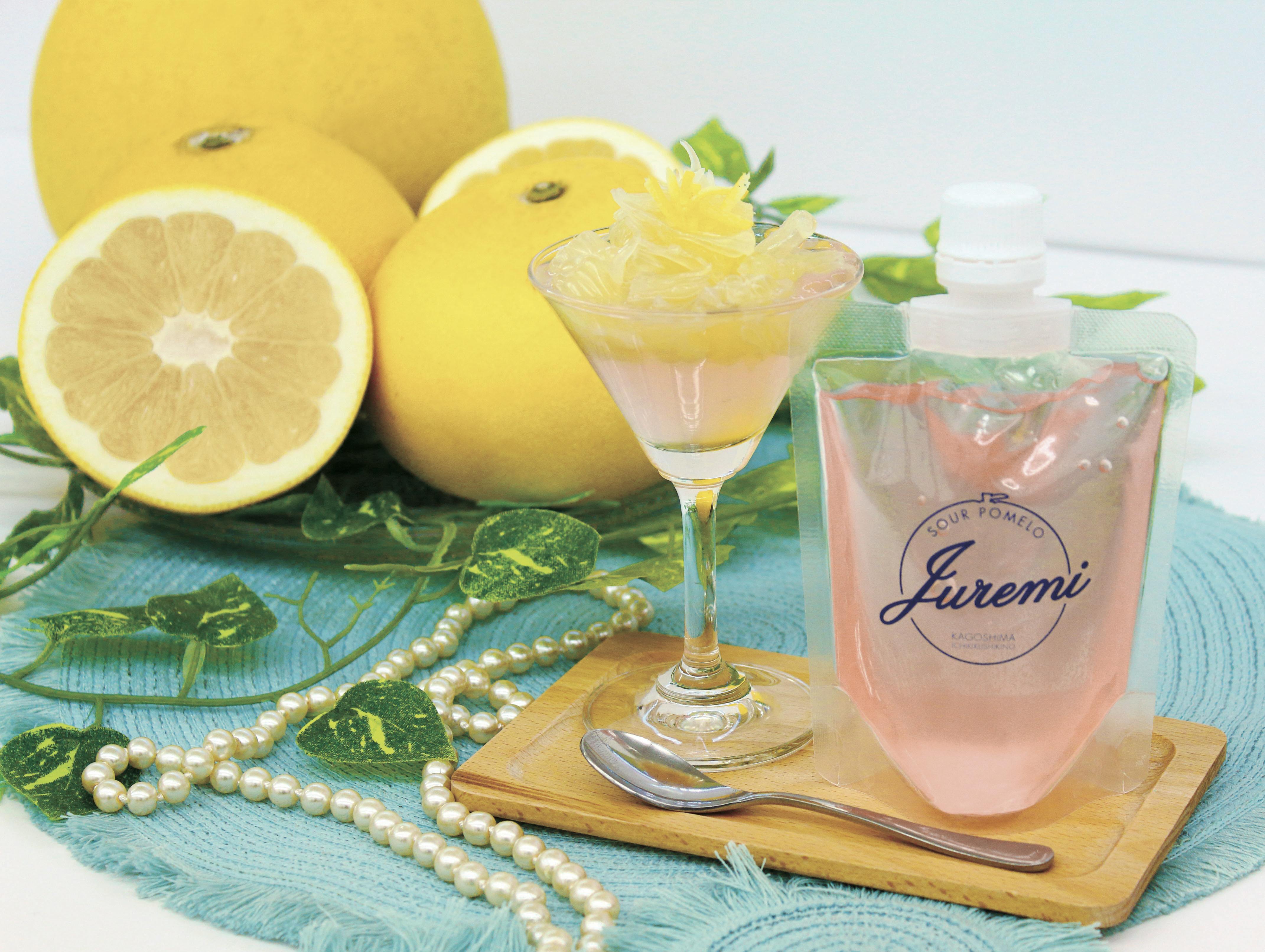 こんな素晴らしい果物を、地元だけに留めておくのはもったいない。どうにかして、広く皆様に認知して頂けるように出来ないものか、でも、そんなに予算はかけられない。そういった、様々な事情から、認知度UP・消費拡大に対して様々な策を考えました。 その結果、当社が販売出来る商品を作り、その商品をサワーポメロに合う物とする事によって、サワーポメロも同時に売ることが出来るようになり、その売れ行きによって、予算を確保しつつ、認知も拡大してゆく。こう言った、ひとつの流れが出来上がり、今回の商品、“サワーポメロに合う新感覚ジュレ「Juremi(ジュレミ)」”を開発するに至りました。