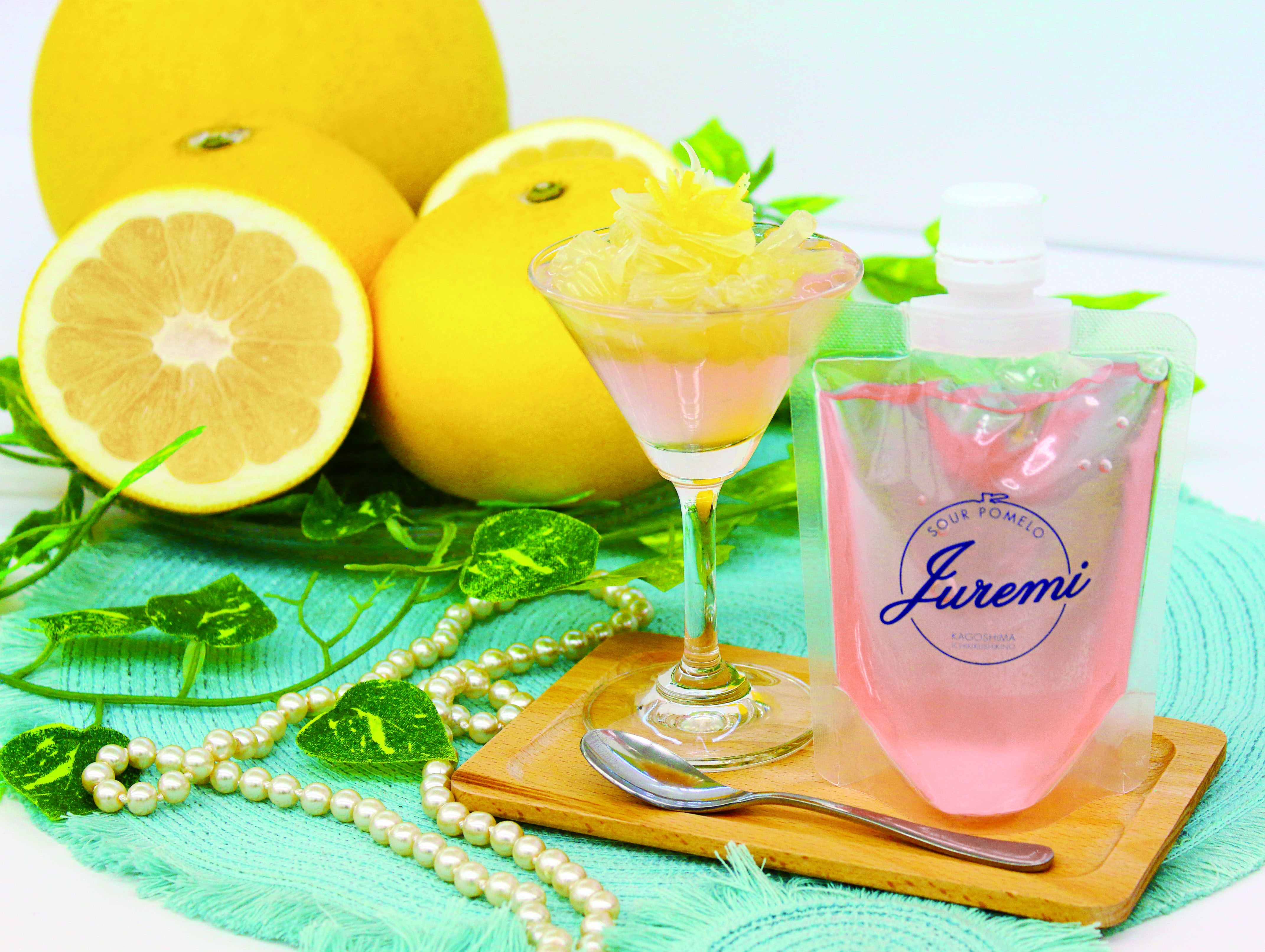 こんな素晴らしい果物を、地元だけに留めておくのはもったいない。どうにかして、広く皆様に認知して頂けるように出来ないものか、でも、そんなに予算はかけられない。そういった、様々な事情から、認知度UP・消費拡大に対して様々な策を考えました。 その結果、当社が販売出来る商品を作り、その商品をサワーポメロに合う物とする事によって、サワーポメロも同時に売ることが出来るようになり、その売れ行きによって、予算を確保しつつ、認知も拡大してゆく。こう言った、ひとつの流れが出来上がり、今回の商品、“サワーポメロに合う新感覚ジュレ「Juremi(ジュレミ)」”を開発するに至りました。
