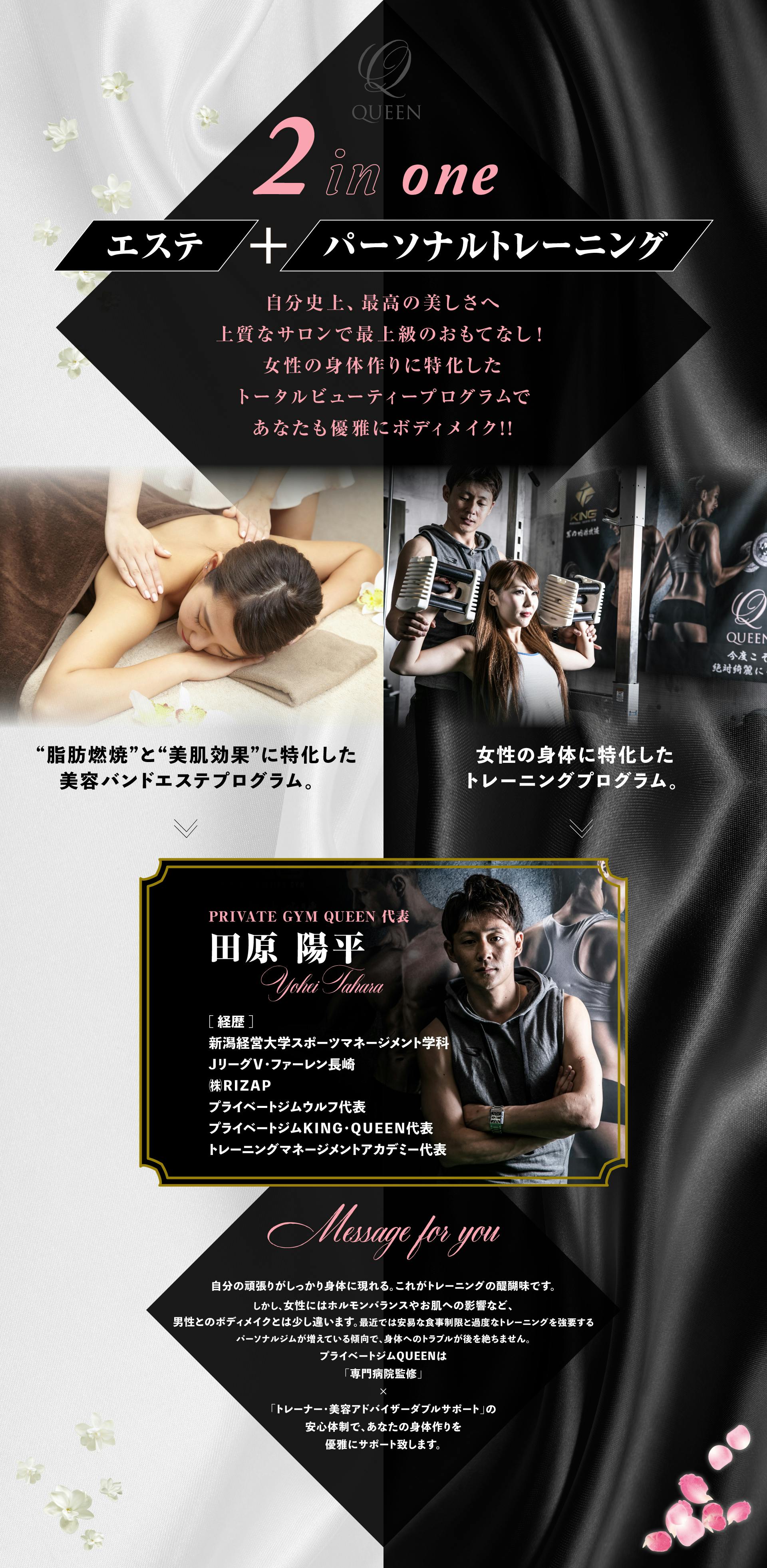 プライベートジムQUEENは「パーソナルトレーニング」×「痩身エステ」×「栄養指導」のトータルサポートで、女性のトータルBeautyを完全プライベート空間でご提供しています。