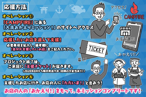 『大洗「おかえり」ミッション!』 と題しまして、新型コロナウイルスが落ち着いた後、チケット購入者に「ただいま」と言って頂き、店の方が笑顔で「おかえり」と返す事で、ミッションコンプリートとなります!