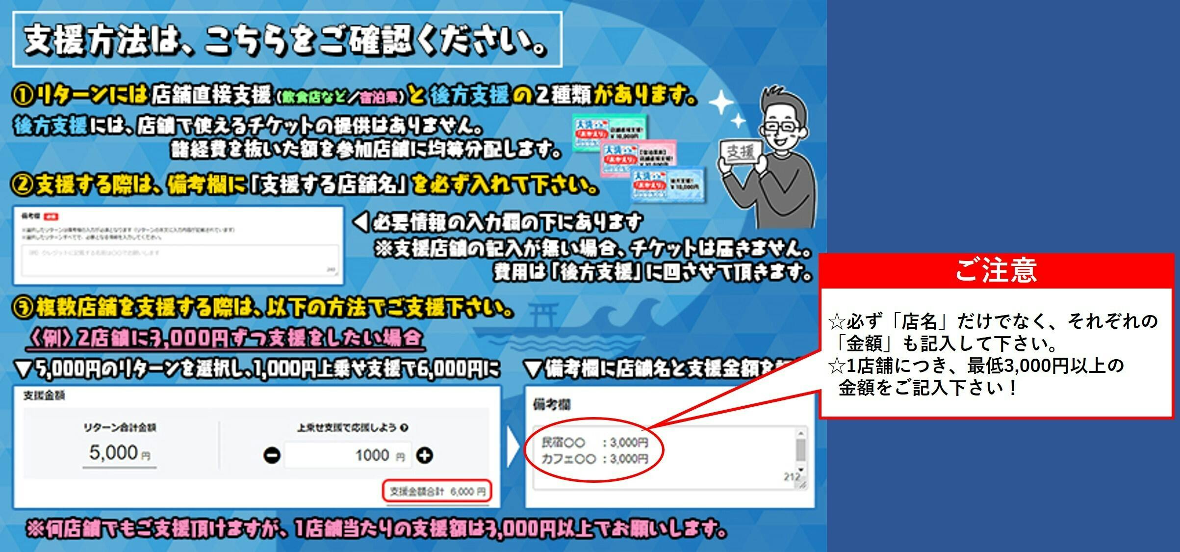 また、1店舗当たりの支援額は最低3,000円からでお願い致します。5,000円の支援で、2店舗にそれぞれ3,000円と2,000円、という形は控えて頂ければ幸いです。その場合、上記の画像のように、「1,000円を上乗せして2店舗それぞれに3,000円」という形でお願い致します。