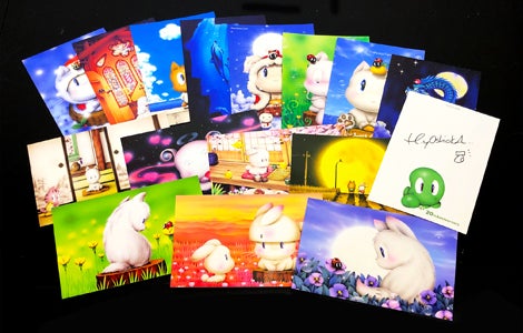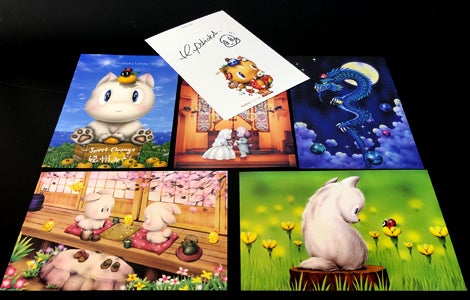 現在販売中のポストカード 5枚とサイン入りの絵ハガキ1枚のセットです。絵柄はこちらで任意に選びます。届いてからのお楽しみ(^^♪