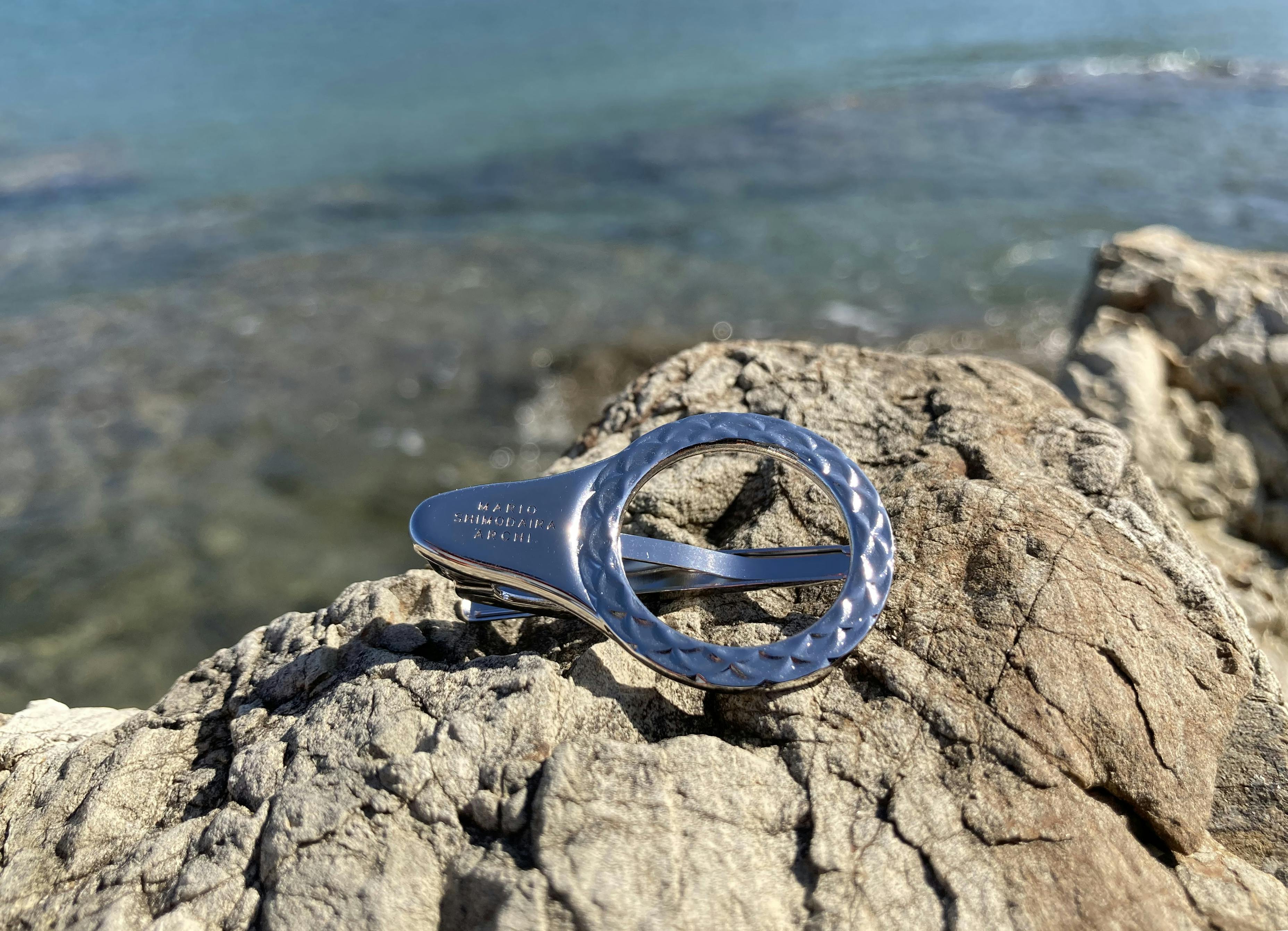 世に出回るネクタイピンはバー型がほとんど。メガネホルダーとして機能するリング部分を中心に