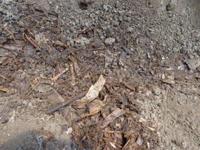 一番上にキノコの廃菌床を撒きます。