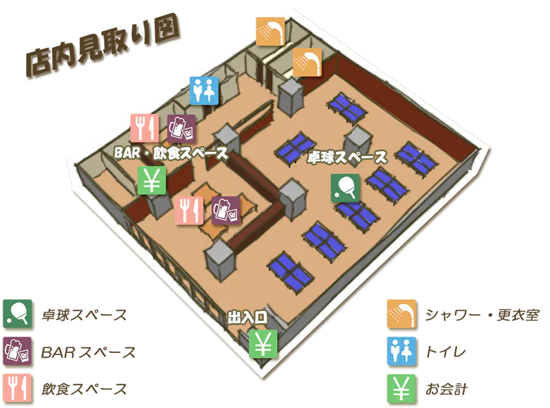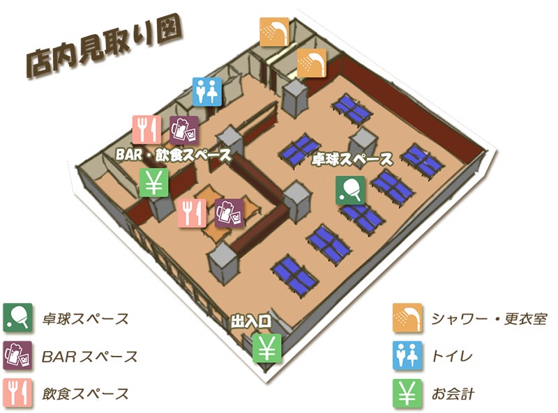 が、この好立地および、練習の合間に軽食を取ったり練習後に軽く一杯も可能な飲食スペース・練習後の汗を流すシャワーブースなどを完備した豊かなスペースを備えていることが逆に仇となり、コロナの影響を受けている間、ただ設備を維持するだけでも非常に厳しい状況です。緊急事態宣言が出ている間は爪に火をともすように耐えておりましたが、解除になったとはいえお客様の安全を考えるとすぐに元通りという訳にもいかず依然、経営的には厳しい状況が続いております。でも、なんとかコロナに負けず乗り切り、これからも卓球人のユートピアとして在り続けたい、そして益々多くの方に卓球の魅力を伝道できる環境づくりを進めていきたい、そんなダンディーの熱い想いをご支援いただきたくお願いします。