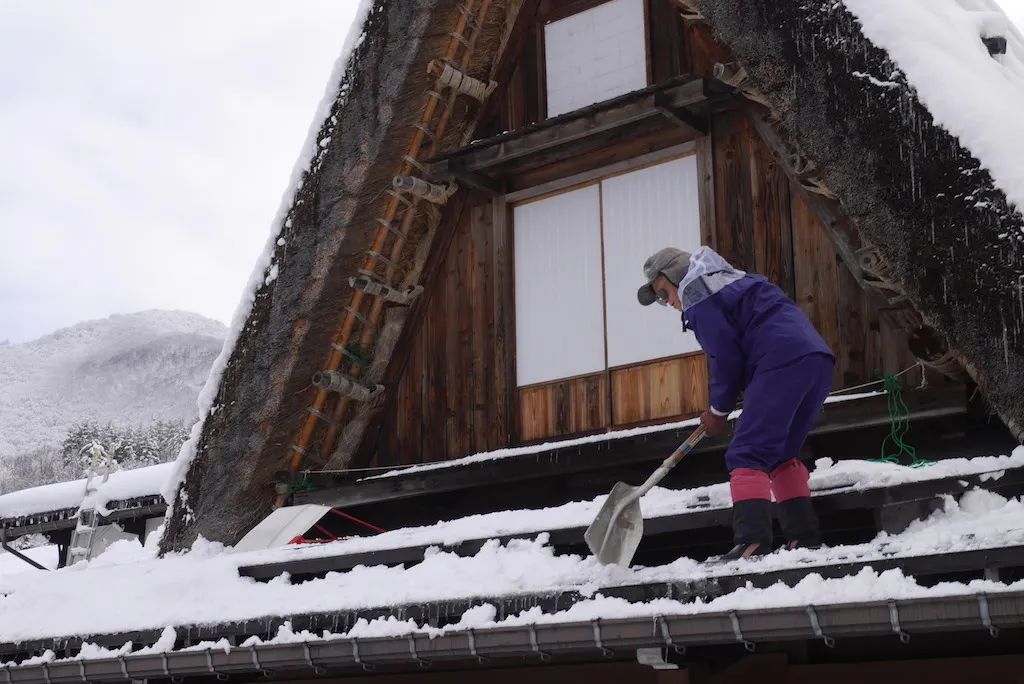 雪の重さで家が潰れてしまうため、屋根の雪かきは大事な仕事です。雪の降った翌日は、朝から村人が力を合わせて、屋根の雪下ろし、雪かきを行います。雪は、多く降るときで、2メートルも積もります。