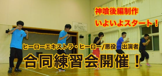 台風の影響で開催が危ぶまれた合同練習会ですが、 無事に開催することが出来ました。 足元の悪い中お集まりいただき、誠にありがとうございました!! 実はこの日がクランクインの予定でしたが、天候不良により延期に・・・ 空いた時間を利用して、練習会までスタッフみんなで衣装製作。 どんな方が来られるのかワクワクしながら練習会を待ちました。 北は延岡、南は日南から総勢33名の皆様が駆けつけてくださいました! まずはウォーミングアップからスタート! お子様連れの方もいらっしゃり、チビッコもその活躍を見守ります。 エキストラチーム10秒、アクターコース15秒の体幹トレーニング 地味にきつい(笑) 基本の技とポージングの練習 その後はヒーローと悪役に分かれて、いよいよ動きの練習を。 ヒーローエキストラの皆様。みんな笑顔(笑) 悪役、戦闘員エキストラの皆様。「よりエモーショナルに」との演出の指示に 皆さん果敢に挑戦されておりました。 アクションスクールレギュラーメンバーはさすがの貫禄! スタッフと共に からみ のお手伝いをしてくださいました。 ありがとうございます!! 最後は全員で総まとめ。 立ち位置などを調整しカメラマンもいれて、本番さながらの練習を。 モニターで実際どのように映っているのかを観ていただき、 2時間の合同練習は終了しました。 ご参加いただきました皆様、長丁場の練習、本当にお疲れ様でした!! そして、ご参加いただき誠にありがとうございました! 実はその後、エキストラの皆様が登場する撮影のリハーサルを行いました。 見学に来ていたヒムガールの二人にもエキストラの役で協力してもらいました。 合同練習の様子はヒムガールの日記にも掲載予定です! ヒムカイザーが倒れ、人々に襲い掛かる神喰。 それを守ろうとする八百万の神々。 どのようなシーンになるのか楽しみにお待ちください!