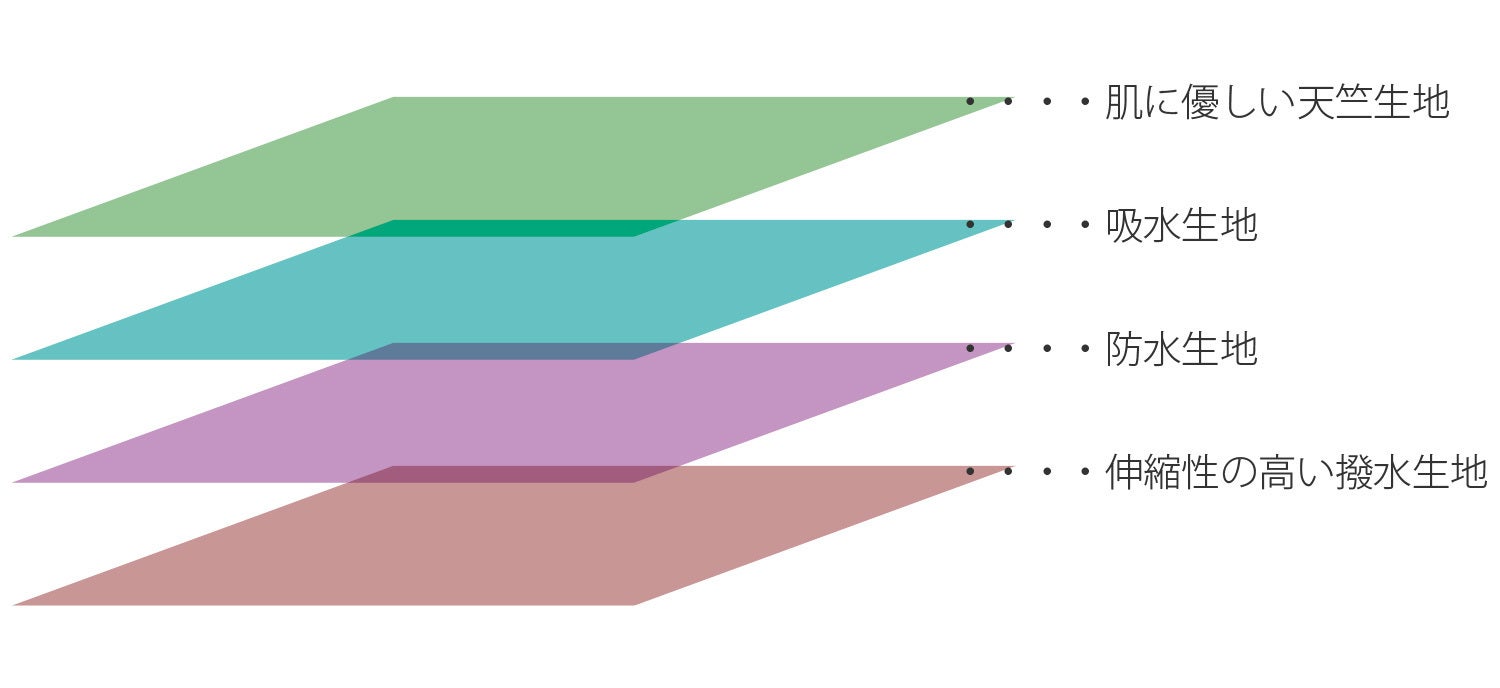 肌あたりのいい吸収速乾効果のある第一階層、吸水効果のある第二階層、防水効果のある第三階層からできています。