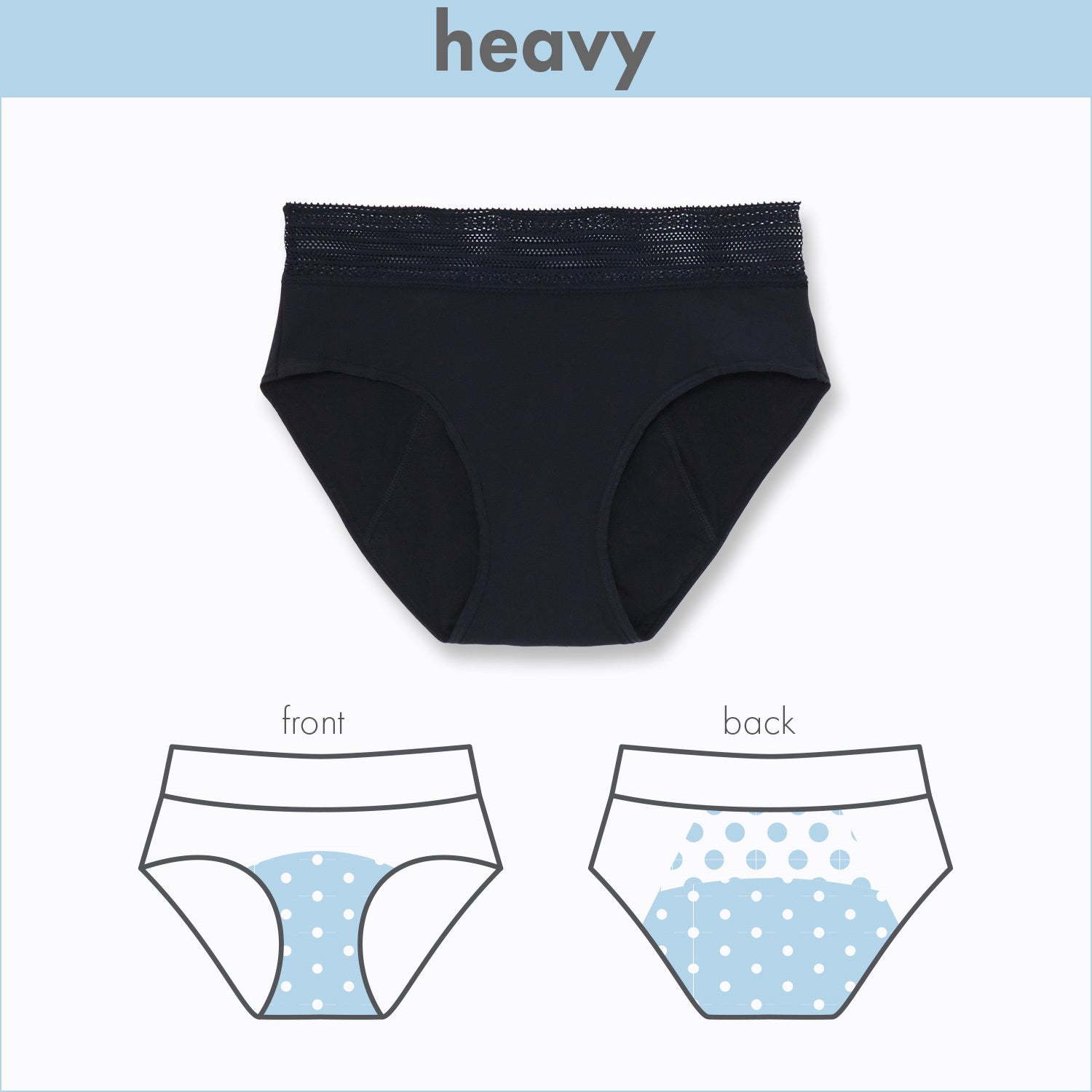 レギュラー、ヘビー はウェストにレースタイプのゴム、足ぐり部分にゴムが通っているので、人によっては締め付けを感じる可能性がございます。