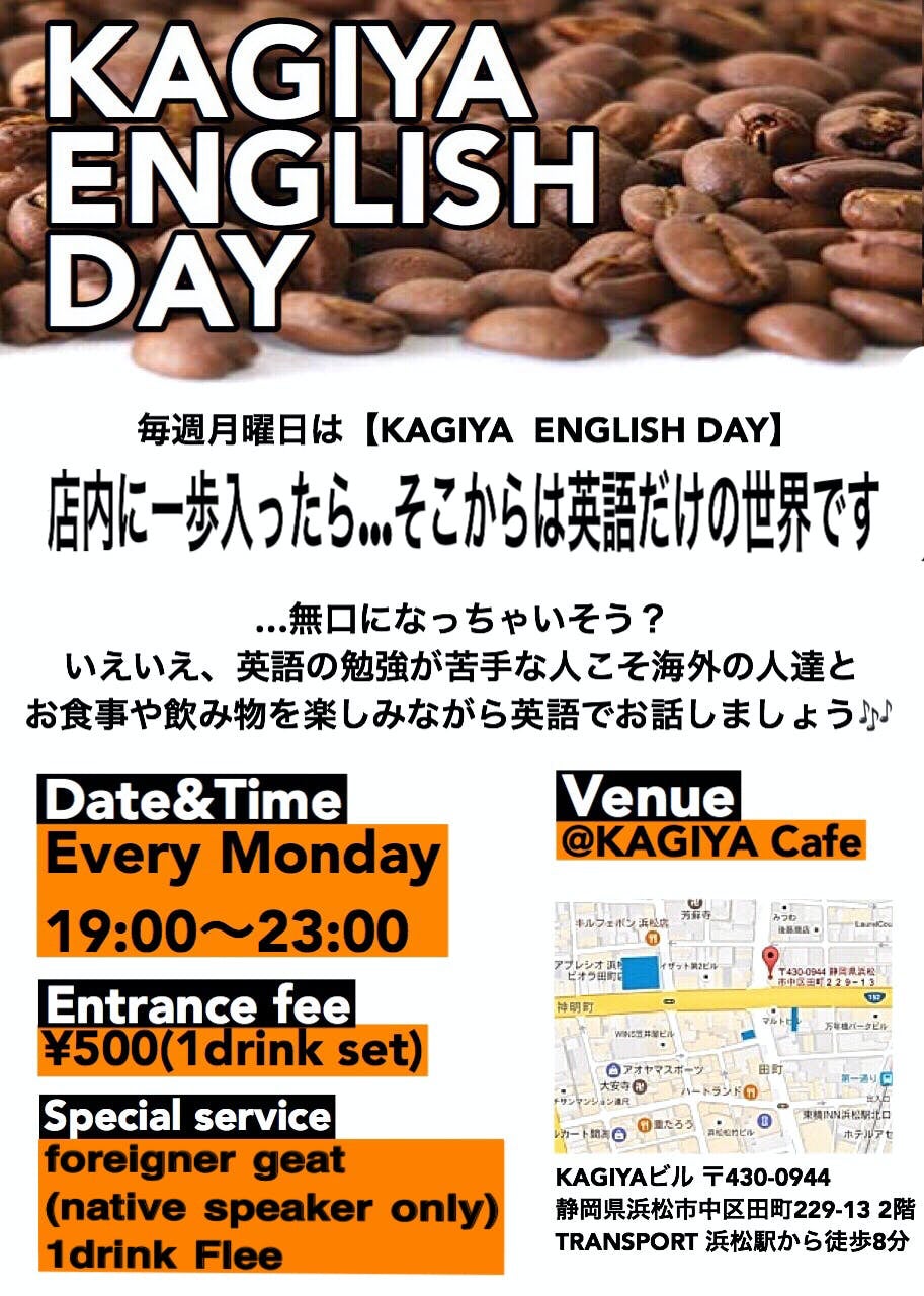 1年前の2月より毎週月曜日は"KAGIYA ENGLISH DAY"という異文化交流、語学勉強の場としても活動を行なっております。