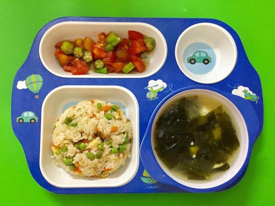カンボジア風のチャーハン・わかめスープ・トマトオクラのサラダ