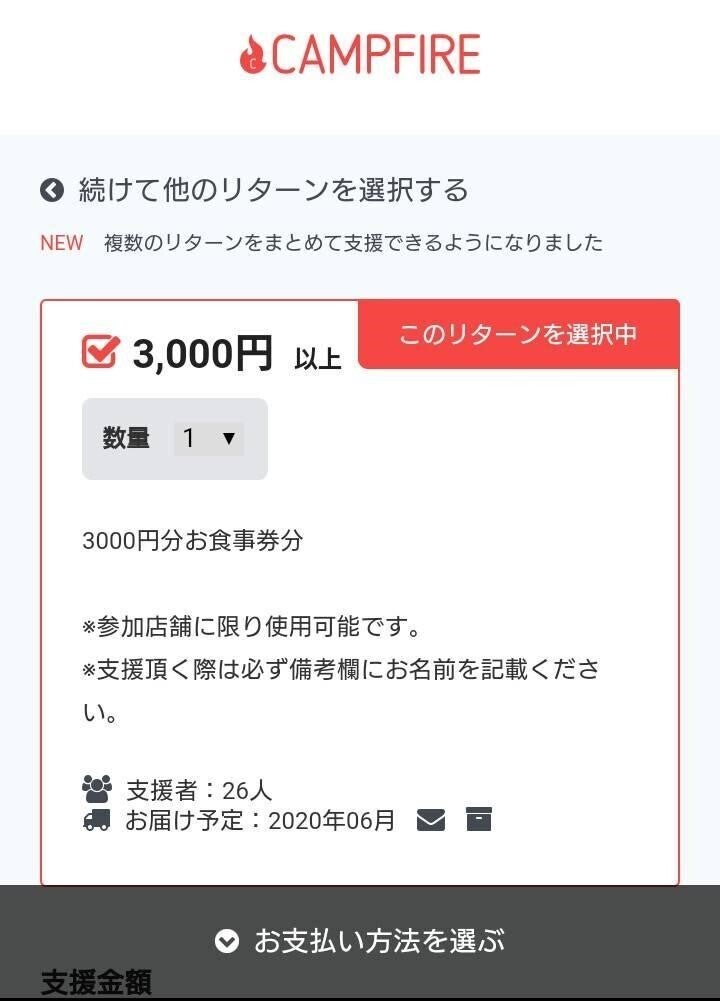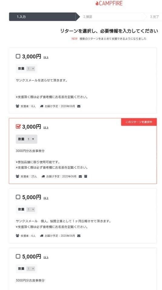 支援する金額に伴い、プランが変わってきます。支援したい金額を考え、その支援したいものの個数を選択してください。(複数のリターンをまとめてご支援することもできます。)