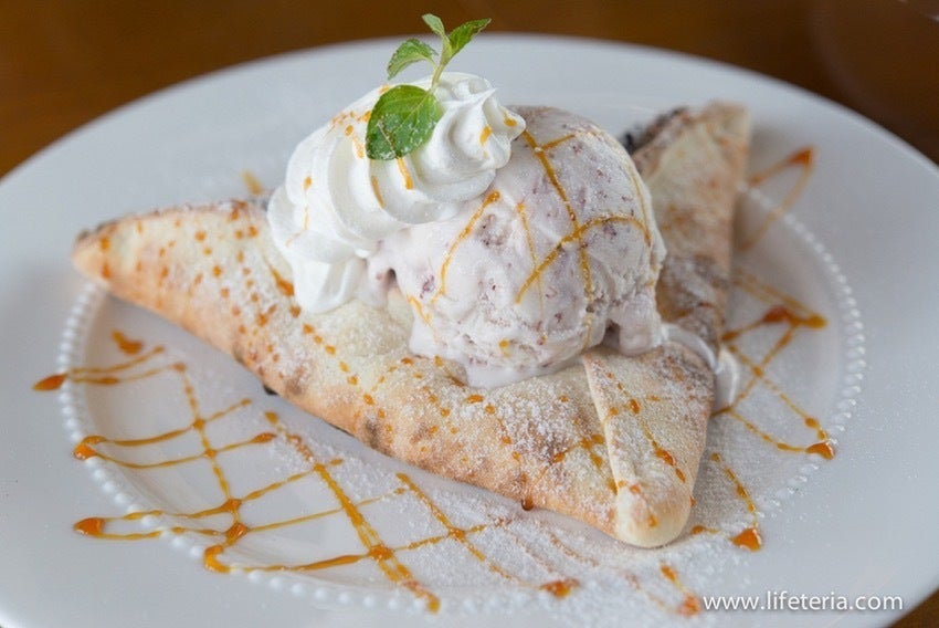 お店人気のメニューは、カスタードクリームと季節のスイーツがピザ生地で包みこまれたスイーツ感覚で楽しめるドルチェ ピッツア。