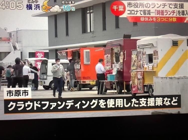 市原市役所では、飲食店さんのフードトラックを招く形での支援を行い、3密を避けた「時差ランチ」を行っています。