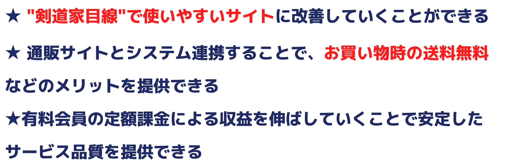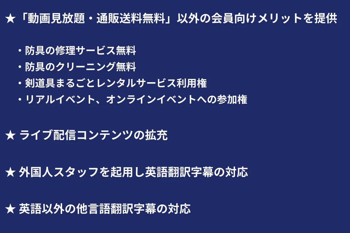 もっと多くの剣道家にサービスを認知してもらい、かつ満足していただけるコンテンツを多数用意していくことを通じて有料会員数を増やし、サービスの黒字化を目指していきます。