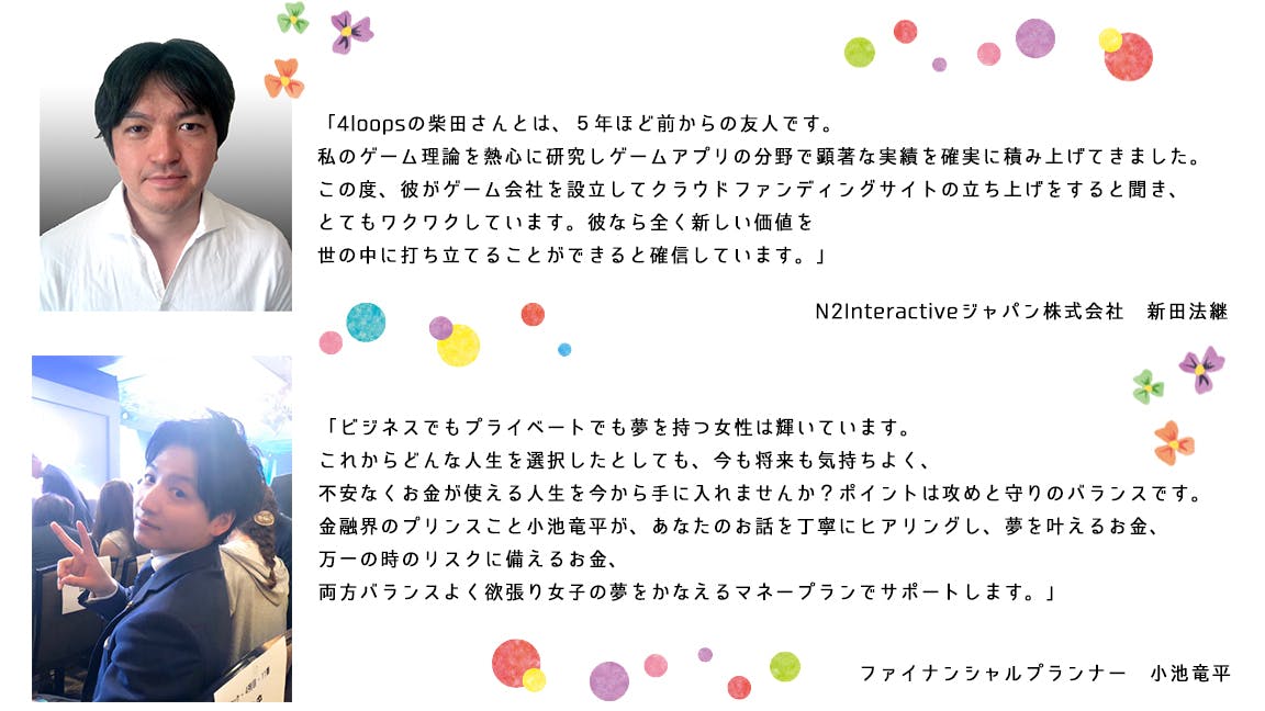 そんな過去から、株式会社4loopsを大きくして一人でも多くのワーキングプアに陥っている男女を雇用することが私の使命と感じています。日本では、女性のワーキングプア率が40%を超えていると言われています。また、男女の格差も大きな問題になっています。その意味で、クラウドファンディングというサービスを通じて、多くの女性が夢を持つきっかけになってくれたら本当に嬉しいことです。