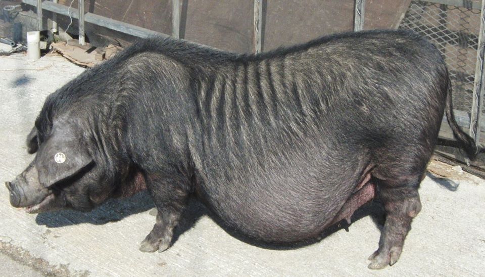 背線が緩く、腹が下垂し、鬣(たてがみ)も観られ、尾が巻きません。典型的なアジアで見られる古いタイプの豚です。