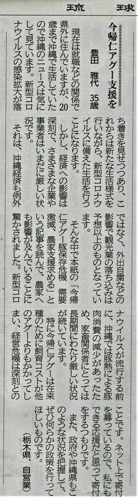 琉球新報 2020年5月31日 社説・声面 『今帰仁アグー支援を』
