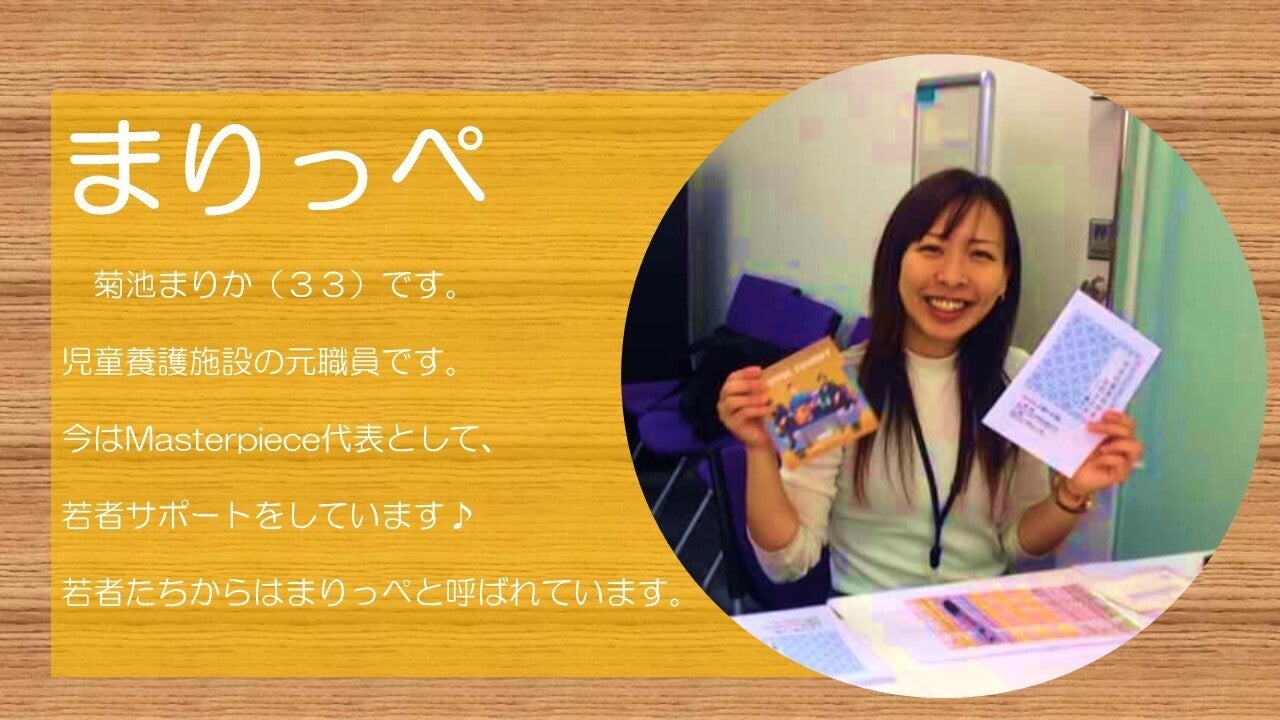 私は児童養護施設を巣立った若者たちをサポートする一般社団法人Masterpieceの代表理事まりっぺ(菊池)です。以前は、施設職員をしていました。