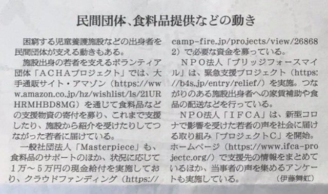 みなさん、こんばんはむっちゃんです。本日、2回目の更新です。立て続けに失礼致します。先日、行いました若者緊急支援 第1段のご報告をさせていただきます。動画の内容のまとめは以下の通りです。==<概要>・募集期間:5月中旬・応募人数:80名・現金支給:2〜5万円の給付・食糧支援:約50件の食糧配送・支援費用:262万円<若者から寄せられた声>「頼るところがなく、生活が苦しい」「未来が見えない」「周りの友達は実家に帰っているのに自分には帰れるところがない」「死にたい」「実際、死のうとしました。」「もう、どうしていいか分からない」「親を頼れない人についてもっと知って欲しい」<支援がこうなって欲しい>・国が言っている事と、窓口で言われる事が違い、戸惑った。統一して欲しい。・支援の対応スピードをあげて欲しい。実生活に支援が間に合わない。・手続きの簡略化・親がいない人への対応を手厚くして欲しい・多様性が広がっているからこそ、より簡潔に制度を理解できる仕組み作り==皆様のご支援があってこそ、今回の支援ができました。本当にありがとうございます。引き続き、皆様のご支援をお願いいたします。支援の報告につきまして、追ってご報告をさせて頂きます。==●Masterpiece代表 まりっぺのnote・国から死ねといわれています *記事●お問い合わせ先・HP:こちら・Masterpiece Twitter:@youre_mp・代表 まりっぺ Twitter:@marikak48*TwitterはDM、リプライなどでお問い合わせください。●本取り組みが、メディア掲載されました!・TBSテレビ グッドラック! 5月21日放映・朝日新聞デジタル *記事・朝日新聞 朝刊 *記事