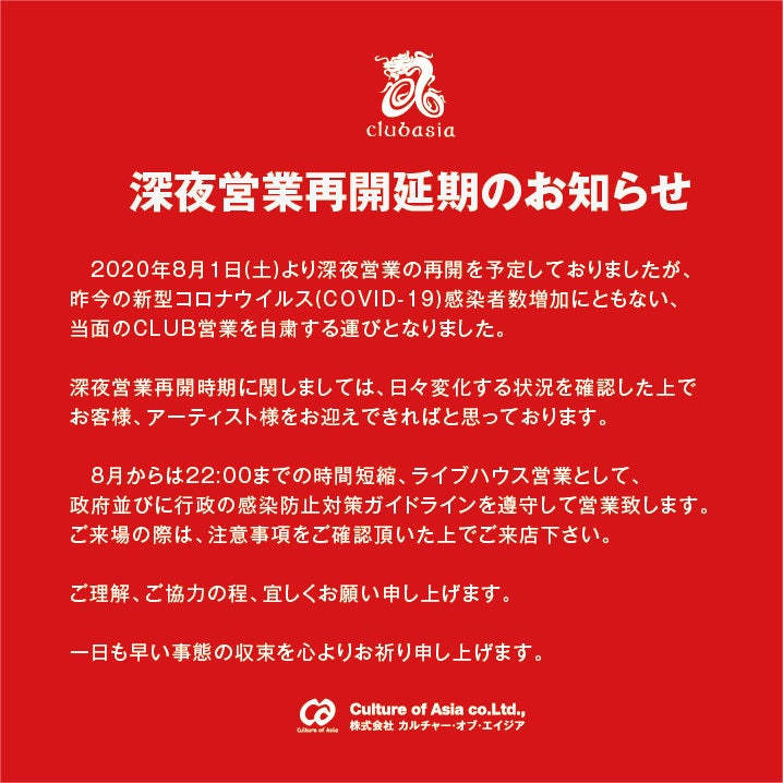 2020年8月1日(土)より深夜営業の再開を予定しておりましたが、