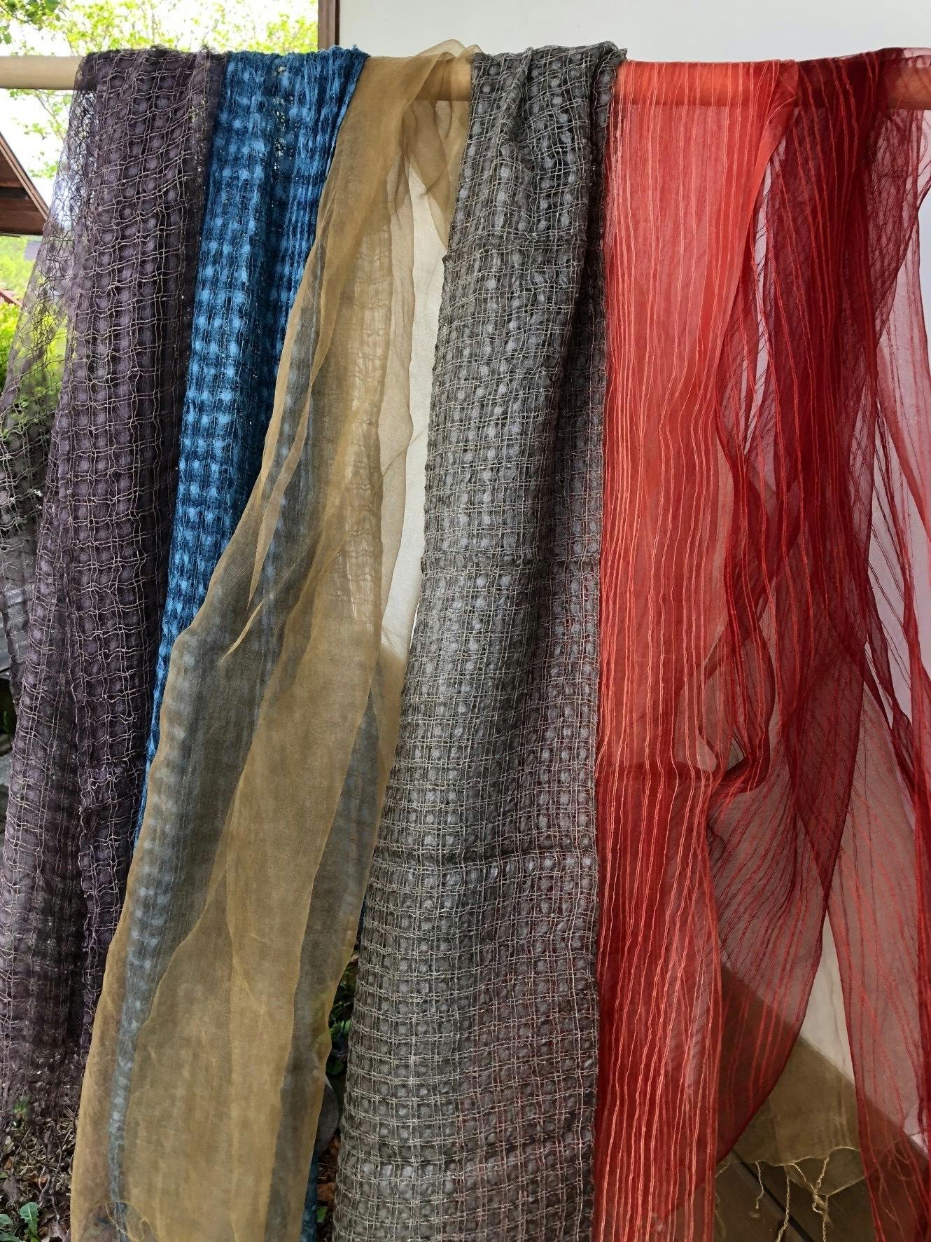 薪でシルクのストールを染めます。あかね、げんのしょうこ 等2種類の草木染めで染めて、それをお持ち帰りいただけます。体験場所 小淵沢『shopのら』の工房