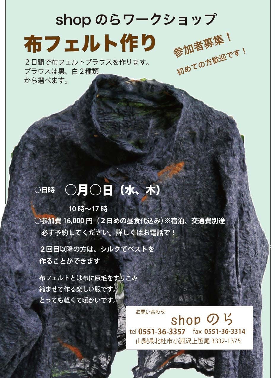 布フェルト体験教室参加券を送ります。布と原毛を合わせてとても素敵なブラウスを作ります。通常1日半で作りますが、お手伝いをして一日で終わるようにいたします。色は黒、または白。そのほかの色は相談してください。