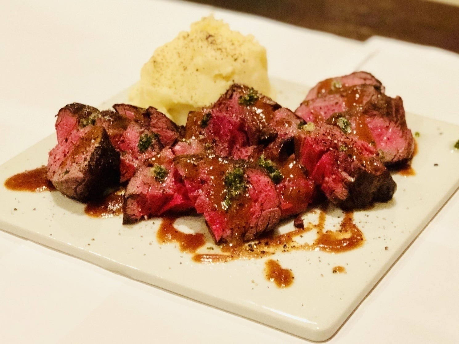 表面をカリッと焼き上げ、オーブンに入れ余熱で火入れをするこだわりのステーキは、ワインにもビールが進むので、僕も必ず注文する一品です。