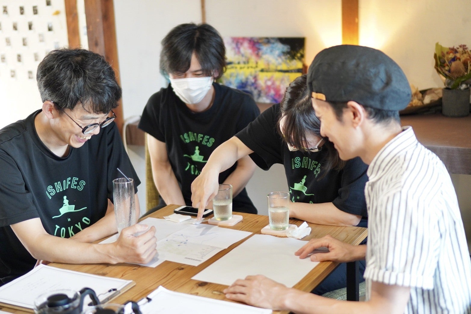 ISHIFES実行委員長のJさんと空と月さんご夫婦と打ち合わせ風の写真を。