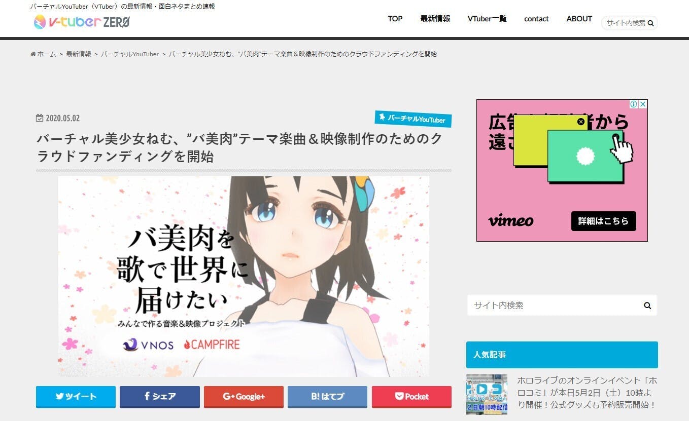 VTuberメディアの「v-tuber zero」さまに私のクラファンを取り上げて頂きましたっ(*´▽`*)