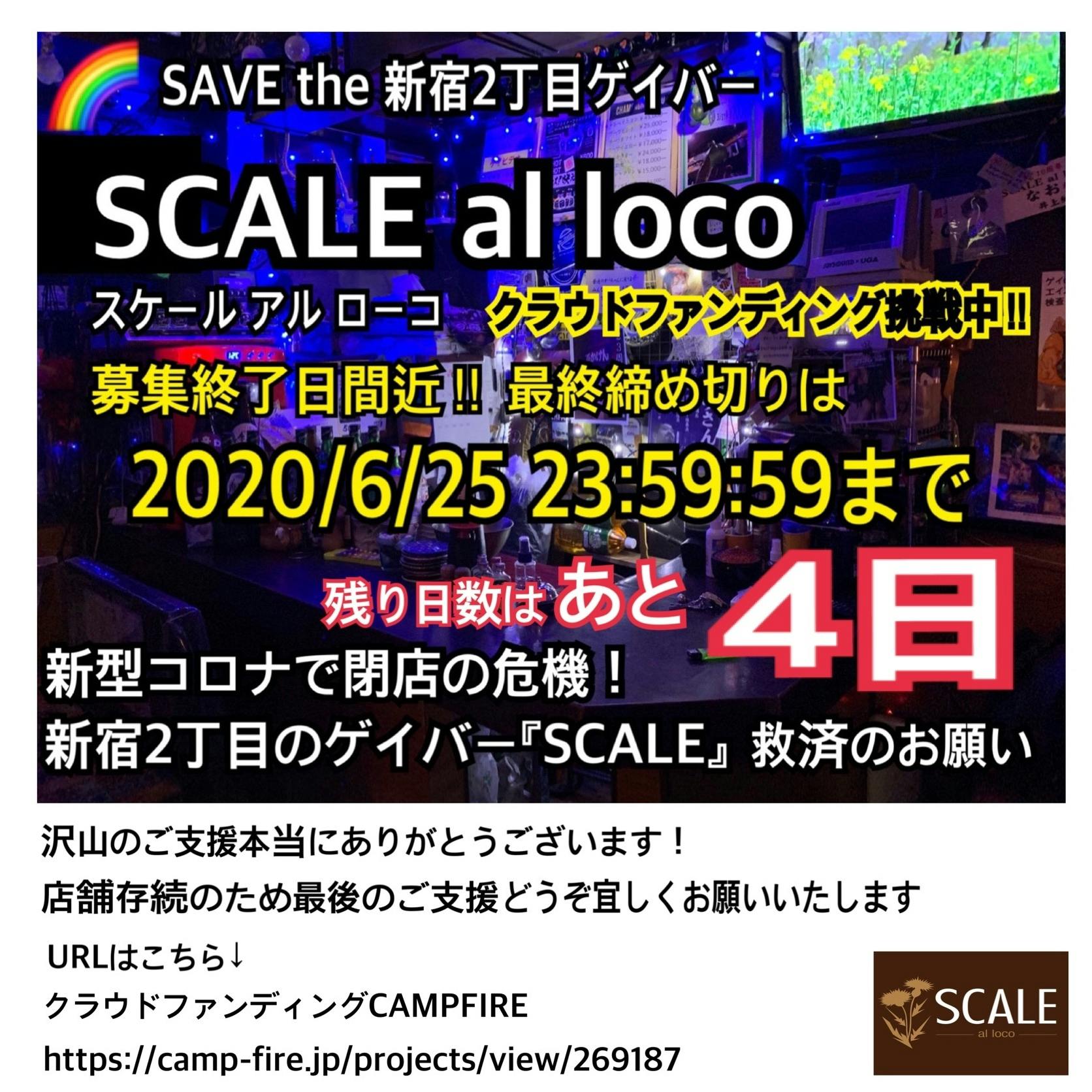 2020/06/19 16:00皆様へクラウドファンディングが、いよいよラスト7日になりました。現在119名様のご支援のおかげで879,500円まで集まっております。本当に感謝しております。ただ、本当のところを言うと、まだまだ資金としては足りないのが現状で、ネクストゴールは100万円です。支援金はクラファンの終了後手元に入るのは7月末です。制限つきの営業が続く中、あと1ヶ月踏ん張れるか。その後も継続できるか。それはまだわかりません。ここからはかなり厳しい戦いになるかとは思いますが、最後まで諦めずに頑張ります。みなさま引き続き、応援、支援、冷やかしなんでも良いので関わっていただけたら嬉しいです。そこで、クラウドファンディング最終日に向けて最後のお願いです。支援リターンの1番上に、寄付や募金のような形の「いいからとっとけよ」という●お気持ち支援2,000円のリターンがあります。もし宜しければ追加のリターンをお願いします!また、知り合いやSNSなどで、このクラウドファンディングがある事を広めて頂けないでしょうか。残すところ僅かのSCALEの挑戦とお願いです。どうか宜しくお願い致します!○rz もっと見る