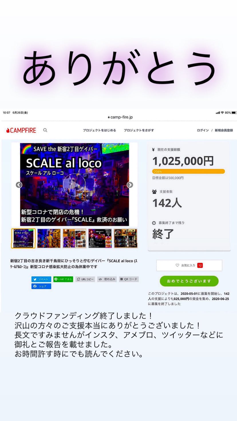 2020/06/26 16:18皆様へ御礼とご報告当店SCALEは、コロナの自粛による影響で店の存続が危うくなり5/1からおよそ2ヶ月に渡りクラウドファンディングCAMPFIREに挑戦して参りました。昨日6/25の23時59分59秒に終了しました。支援者数142人支援総額1,025,000円ご支援下さった皆様のおかげで目標額の500,000円をはるかに超える額になりました。本当に沢山の方々に応援を頂き、本当に本当にありがとうございます。支援金は7月末にキャンプファイヤー側の手数料を引かれた金額が手元に入ります。支援金の使い道ですが、 ●「2,000円のお気持ち支援」という「いいからとっとけよリターン」分は、過去数ヶ月分の損失分と今後の運営金に充てさせて頂きます。 ●「3,000円以上の支援リターン」は前売りチケットをご購入頂いたという形で6/26から支援金額分当店でご飲食頂けます。 ●「3,000円の12周年記念DVDリターン」につきましては大変申し訳ございませんが、現在DVD作成最終追い込み中なので完成まで今しばらくお待ち頂く事をお許し下さい。完成次第お知らせすると共に、お店での手渡し、若しくは発送という形を取らせて頂きます。 ★いづれの方々にもおひとりずつお礼のメッセージを順繰りにお送り致します。本日キャンプファイヤー側から皆様の連絡先を教えて貰い次第開始します。全ての方に届くまでお時間を頂く事になるかと思いますが、そちらもご了承頂けるとありがたいです。なお、6/1から営業再開はしております。コロナ問題が終息するまでは感染拡大予防対策の為、人数や飲食時間の制限など皆様にはご不便をおかけする状況が続きますがどうぞご理解の程宜しくお願い致します。ただ実際のところは、再開してもまだ客足が遠のいていたり混雑を避け気を使って下さる方々も多く来店を控えておられるかたもいらっしゃるようで、残念ながら以前のような売上には程遠い毎日です。ワクチンの開発が進まないことには、今後も店を存続するにはかなり辛い状況は続くと思われます。皆様のご健康が1番ですので無理はお願いできませんが、どうぞ頃合いを見てSCALEまで足を運んで下さったら幸いです。長くなりましたが、兎にも角にも、昨日は残り数時間立て続けにご支援のお知らせメールが来る度に涙が出て仕方ありませんでした。スタートから昨日までの皆様のご支援には何度ありがとうと言っても足りません。また、私と同じようにネット上のシステム操作が不得意な方々もおられ、違う形での支援をして下さった何人もの方にも御礼申し上げます。本当にありがとうございました。この御恩はわたしがボケない限り一生忘れません。2020/6/26(金) SCALE al loco 店主 布目直之 もっと見る