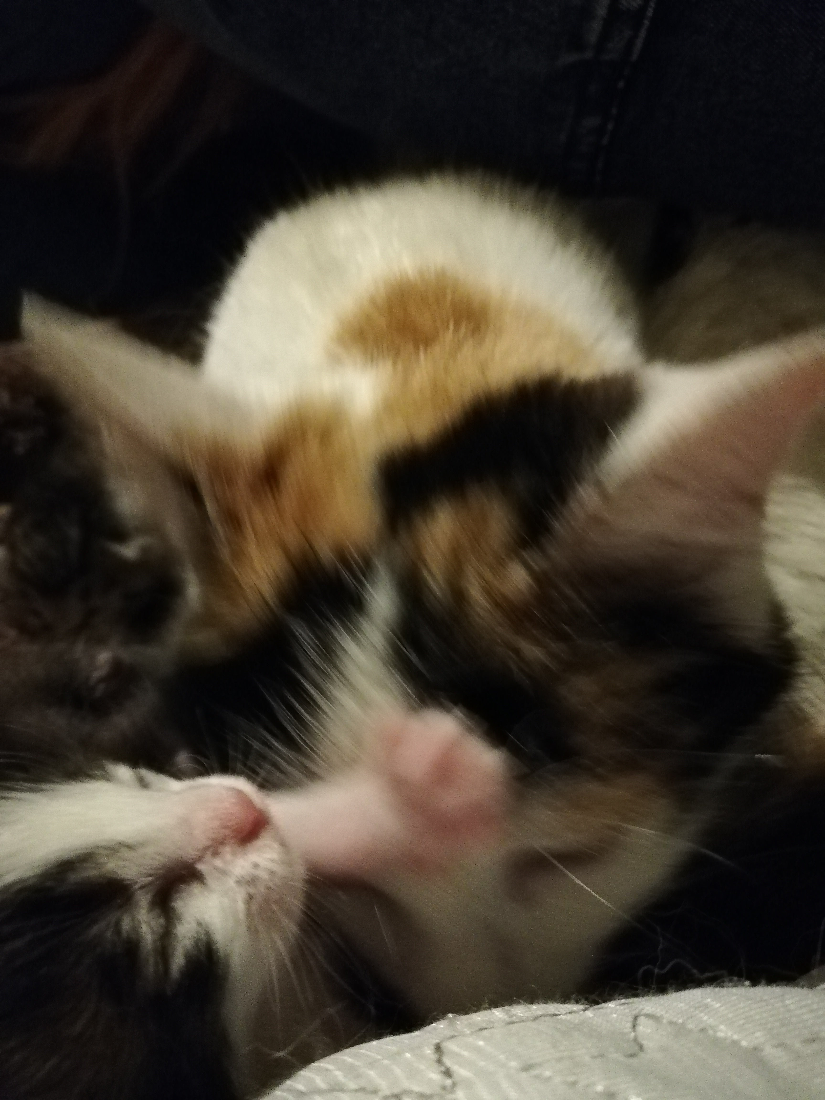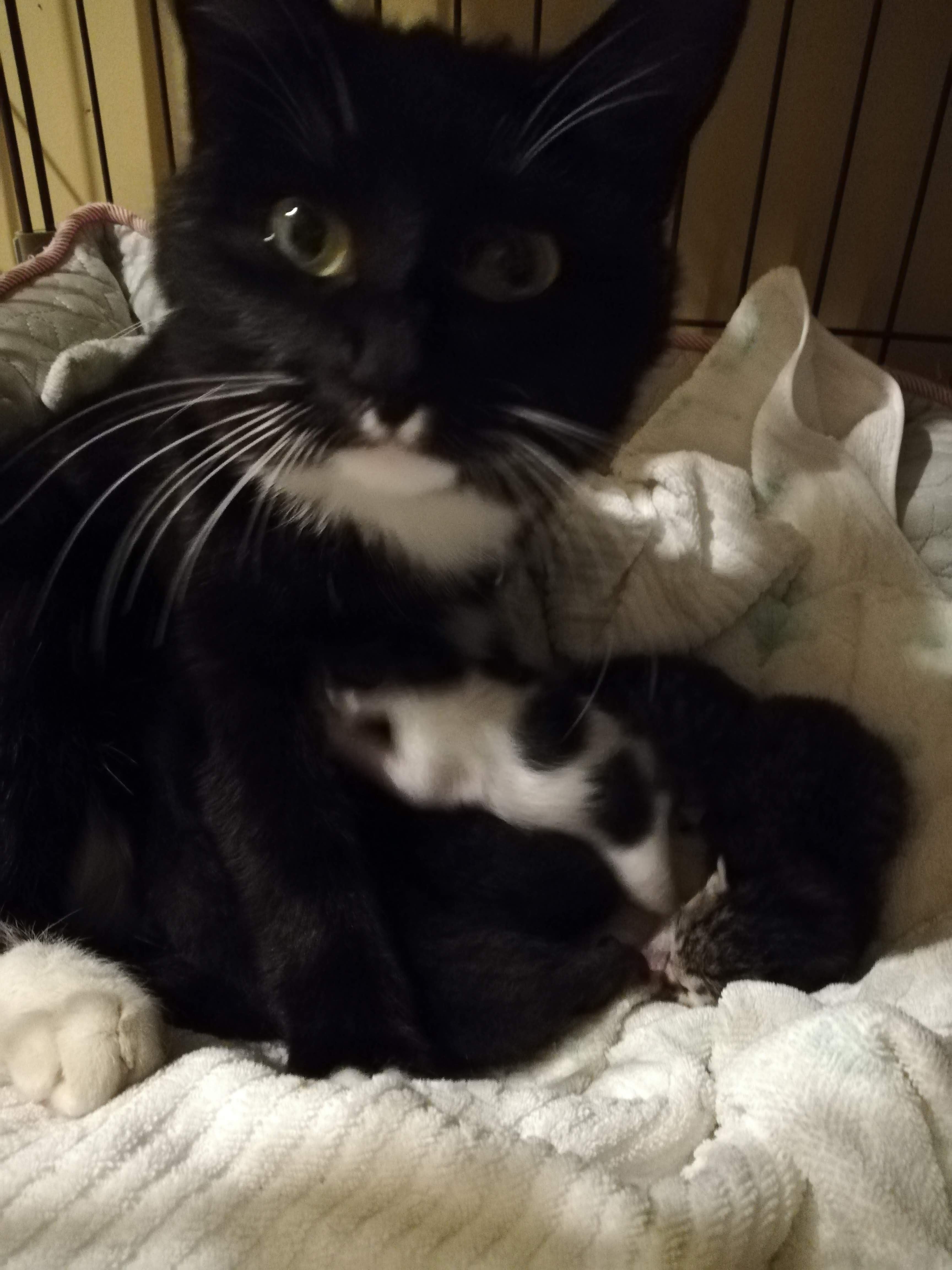 ※5月4日(黒白さん)5月6日(三毛さん)出産しましたが三毛さんは育児放棄の為白黒さんに育ててもらってす!