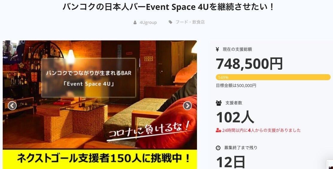 2020/05/18 18:12リターンの追加更新 第3弾本日追加されたリターンの告知をさせていただきます。リターンに協力してもらった人の紹介はまた詳しくさせてください。めちゃくちゃ想いを込めた紹介をさせていただきたいと思います。【追加リターンの紹介】チャレンジャー応援企画 出演券4Uグループがよく出演している人・人チャンネルのクリエイターのよっしーのリターン想いを持って活動してる方、チャレンジしてる方の想いを語ってもらうチャレンジャー応援企画への出演券を提供してもらいました!【熱く生きたいあなたへ『一歩踏み出す情熱セッション券』】限定1名おかっちと親交の深い御縁屋の梅ちゃんこと梅崎さんのリターン題名からもわかるくらい熱き男。情熱セッションを1人限定で提供してもらいました!梅ちゃんの熱い、いやアッツアツなセッションであなたも前に進めるはず! 【Greenmanビジネス相談室】限定5名7つの事業を多角経営するかの有名なGree nmanのリターングリーンのスーツといえば?!でお馴染みのグリーンマンにマンツーマンでビジネス相談できるリターンを提供してもらいました。まだはじめてない人からビジネスを初めて悩んでいる方など幅広く相談できる権利になってますので、是非! 来店時に1日1杯サービスされる権利 【EventSpace4U】限定20名EventSpace4Uのリターン限定20名となりますが、とてもお得なリターンを追加させていただきました。バンコクの常連さんはお早めにお買い求めください! 【稲葉のDJ教室】EventSpace4U店長の稲葉こうのリターン知ってました?こうはクラブでも回すようなDJをやってたこともあるんです!!稲葉のイベントコンサル〜夢を叶えますSP〜EventSpace4U店長の稲葉こうのリターン理想を実現に近づけるようなイベントをコンサルさせていただきます! もっと見る