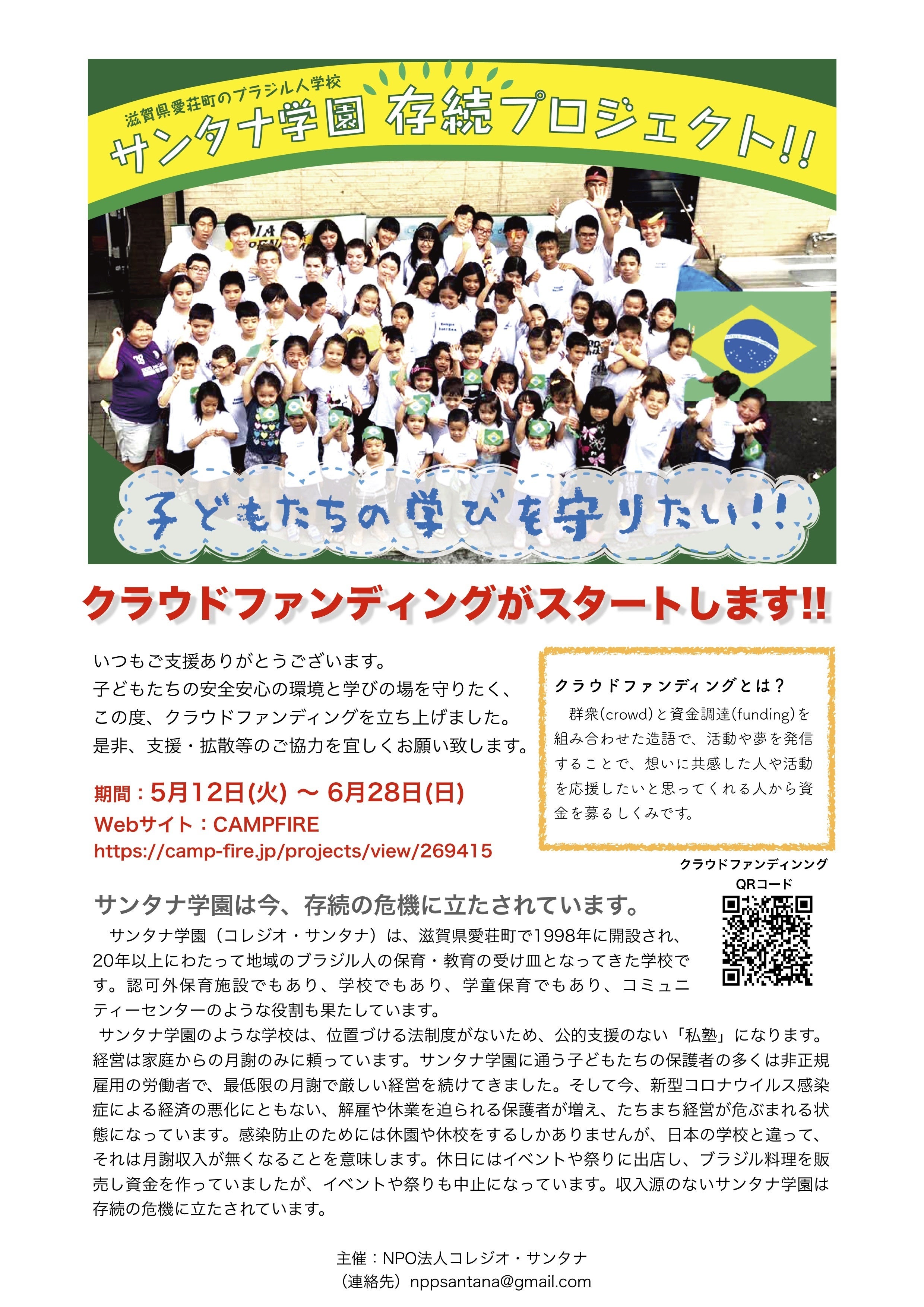 クラウドファンディング残り14日!となりました。今一度みなさんに、拡散のご協力お願い致します。●Facebookのシェア●Instagramのフォロー( ID: colegiosantana.shiga)●チラシもまだ少しあります。配っていただける方、置いていただける店舗様がありましたらメール(nopsantana@gmail.com)を頂けると幸いです。新型コロナが発生した当初は、目前の学園存続危機!で頭がいっぱいでしたが、緊急事態宣言も解除され、withコロナの時代になり、感染症対策、衛生面の強化や再び起こるかもしれない休校への対策、市町や県との連携など、改善する課題が山盛りです。引き続き皆様のご支援を宜しくお願い致します。Campfire:ネクストチャレンジ!『子供たちを守りたい!』滋賀県のブラジル人学校の存続のための支援プロジェクトhttps://camp-fire.jp/projects/view/269415NPO法人コレジオ・サンタナ 柳田