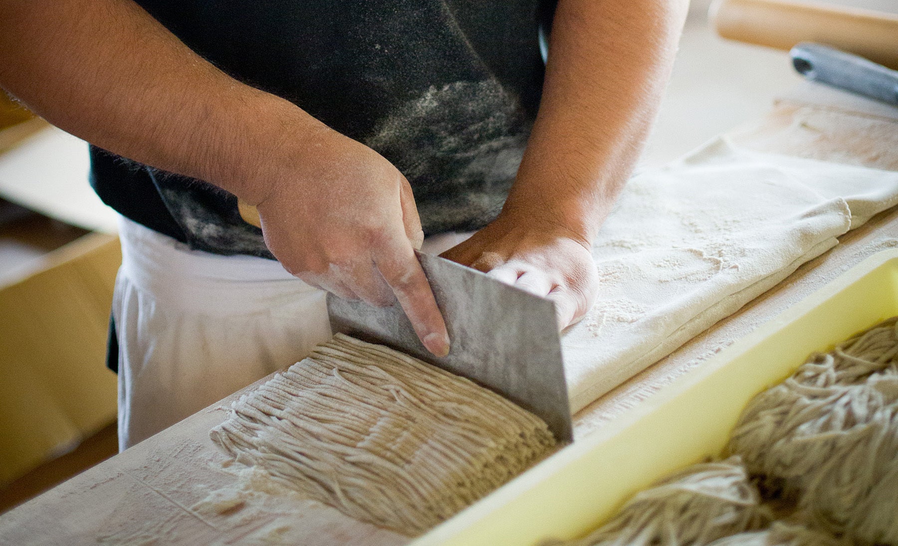 そばは外一(とわり)の手打ちです。あえて乱切りにすることでタレに絡みやすく、食感に変化を持たせています。そば粉は地元のそば(山形県産)を使用し丁寧に自家製粉したものです。