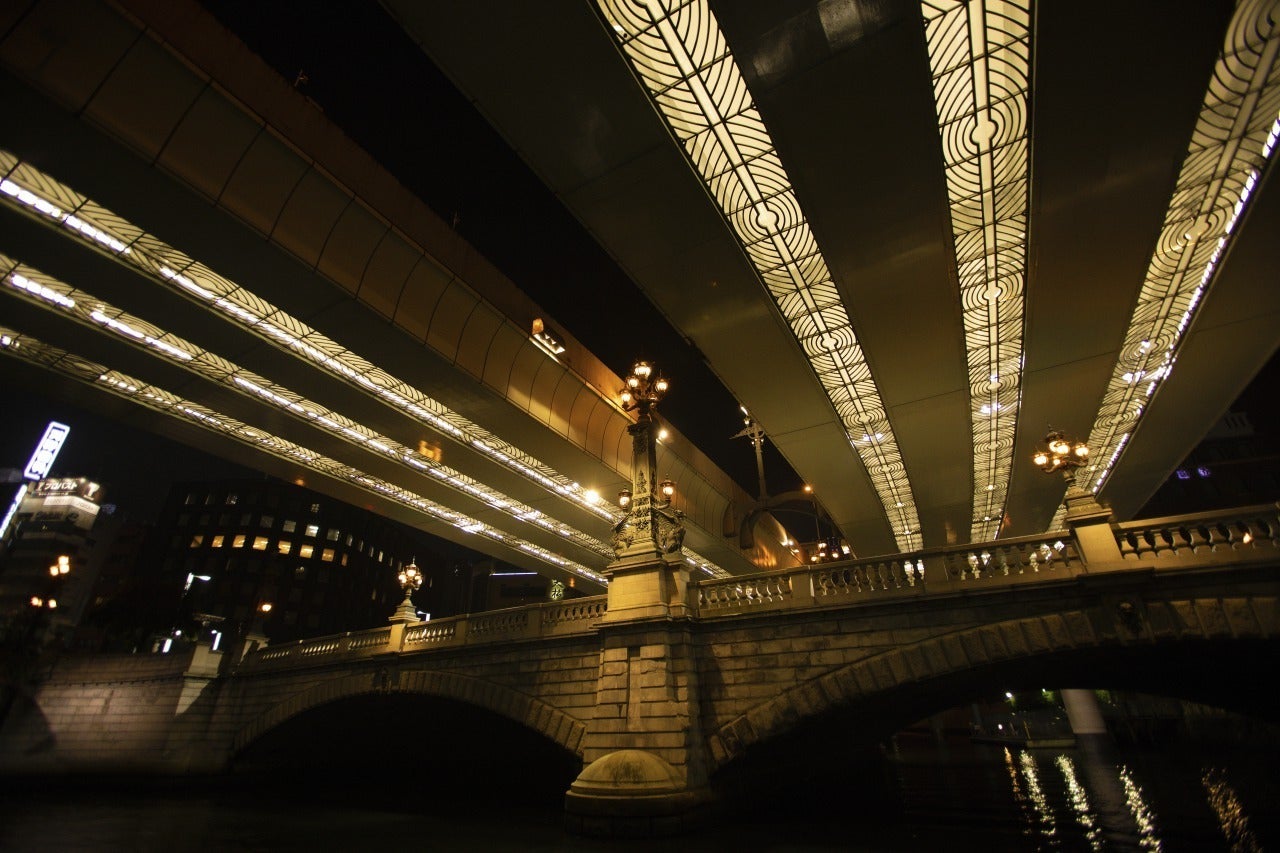 美しく水面と周囲を照らす、沢山の橋のライトアップ。